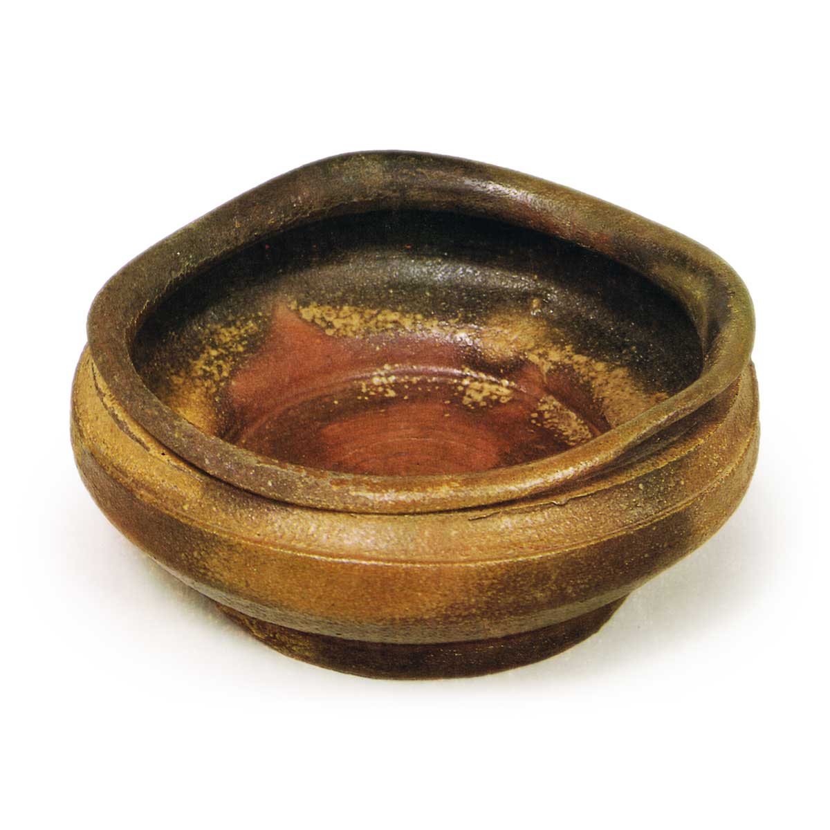 备前沓形鉢 备前备前沓形鉢 2025.09.07 备前沓形鉢 备前沓形鉢 高7.6厘米 口径16.0×18.2厘米 底径13.5厘米在怀石料理中,此碗或用于盛放佐酒小菜或腌渍菜肴。器形轻巧灵动,烧制效果亦极富韵味。据传曾为松平不昧公所珍藏,其慧眼独具之选果不负名声。高台呈圆座状,器身浑圆饱满,边缘反卷扭曲的口沿扭成鞋形。器身内侧三处圆形凹陷处,自内向外遍布浓郁的芝麻釉,局部可见焦黑痕迹与釉下肌理。尤为惊艳的是底部的釉色,肩部环绕的细线雕刻更添韵味。此作应属庆长年间(1596-1615)之后的作品。