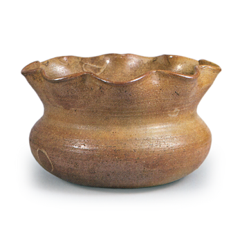 备前矢筈口耳付水指 备前备前矢筈口耳付水指 X Facebook Hatena Bookmark LINE Pinterest 复制 2025.09.082025.11.14 备前矢筈口耳付水指 高21.4厘米 口径17.2×19.9厘米 胴径26.5厘米 底径20.5厘米在备前水指中,此器当属体型最为硕大、身形最为挺拔之作。其浑厚饱满的口部采用矢筈口造型,胴体上部两侧附有耳饰,上下胴身饰以强劲的笤帚纹雕刻。底面应为平底。自口沿至胴体单侧有灰痕,整体烧制致密坚实,胎体略显粗粝。平底处残留半圆形细窄的支足痕,并刻有窑印。内壁亦见两处大型角形印章,然因施印不佳,印纹未能清晰显现。实为一件气势磅礴的力作水指。