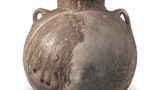 备前耳付水指 备前备前耳付水指 2025.09.082025.11.14 备前耳付水指 高19.5厘米 口径15.0~16.5厘米 左右23.2厘米 底径19.0厘米口部造型似箭筈口风格,但肩部略微外展,并在肩部两侧附有耳饰。口内呈红色,一侧肩部至器身覆有胡麻釉,另一侧则烧制成红色。器身上下施有强劲的笤帚纹,纵向亦刻有深邃的笤帚痕迹。底面中央残留窑印。此作例作为矢筈口耳水指,应属古雅风格,推测为天正年间作品。