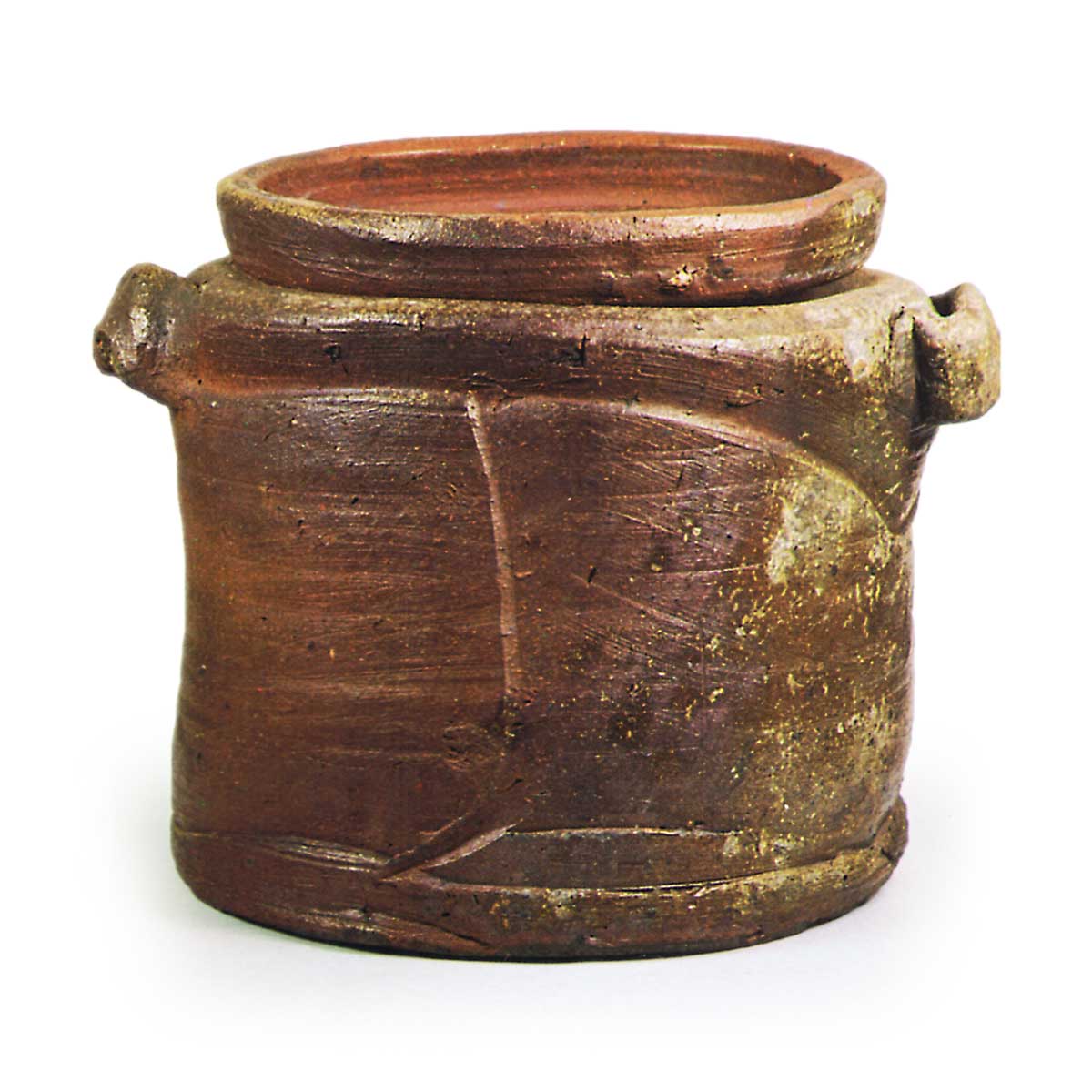 备前耳付水指 备前备前耳付水指 X Facebook Hatena Bookmark LINE Pinterest 复制 2025.09.082025.11.14 备前耳付水指 高19.5厘米 口径15.0~16.5厘米 左右23.2厘米 底径19.0厘米口部造型似箭筈口风格,但肩部略微外展,并在肩部两侧附有耳饰。口内呈红色,一侧肩部至器身覆有胡麻釉,另一侧则烧制成红色。器身上下施有强劲的笤帚纹,纵向亦刻有深邃的笤帚痕迹。底面中央残留窑印。此作例作为矢筈口耳水指,应属古雅风格,推测为天正年间作品。