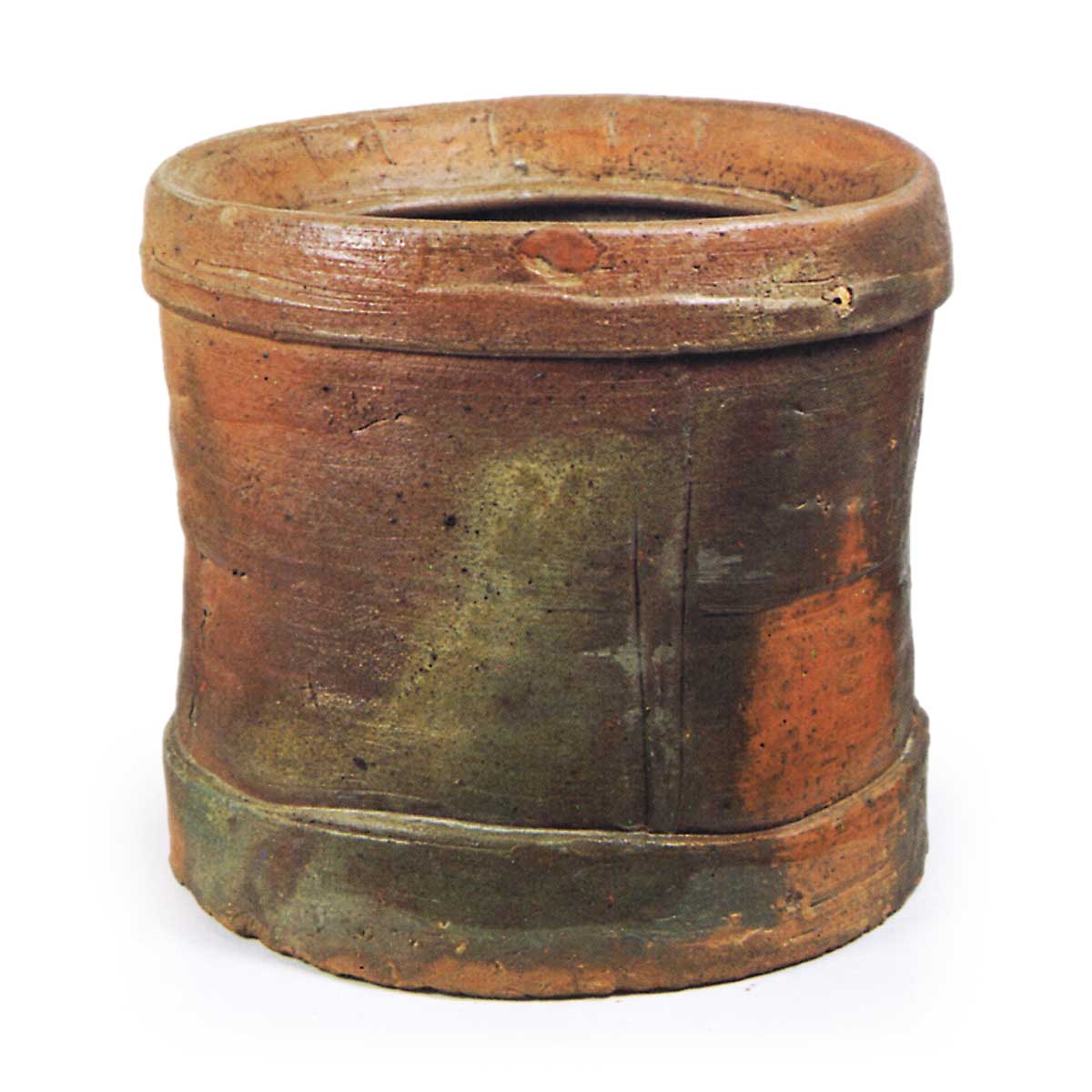 备前矢筈口水指 备前备前矢筈口水指 2025.09.082025.11.14 备前矢筈口水指 高18.6厘米 口径19.8厘米 底径19.0厘米造型浑厚有力。口部深直内凹,外缘与底圈均以笤帚痕刻出阶梯状纹理,器身三面各饰两道纵向笤帚纹。窑变烧肤之美尤为突出,赤褐色或灰黑色焦痕更添韵味。底面呈浅楔形。此类桶形水指器作风古雅,应为天正年间作品。