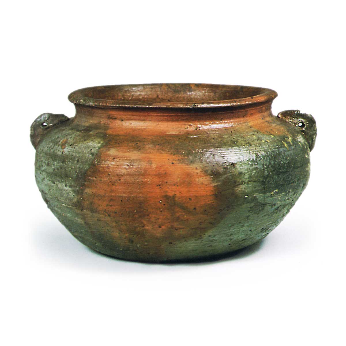 备前耳付平水指 备前备前耳付平水指 2025.09.082025.11.14 备前耳付平水指 高16.2厘米 口径17.2~17.5厘米 胴径19.5厘米 底径13.5~13.8厘米其形似广口釜,虽属异形器,但尚有二三件同类例证。胎土烧制柔润,窑变色泽鲜明。肩部两侧耳形呈远山状颇为有趣。松叶状窑印以笤帚刻法施作。应为室町时代后期至桃山时代前期之作。