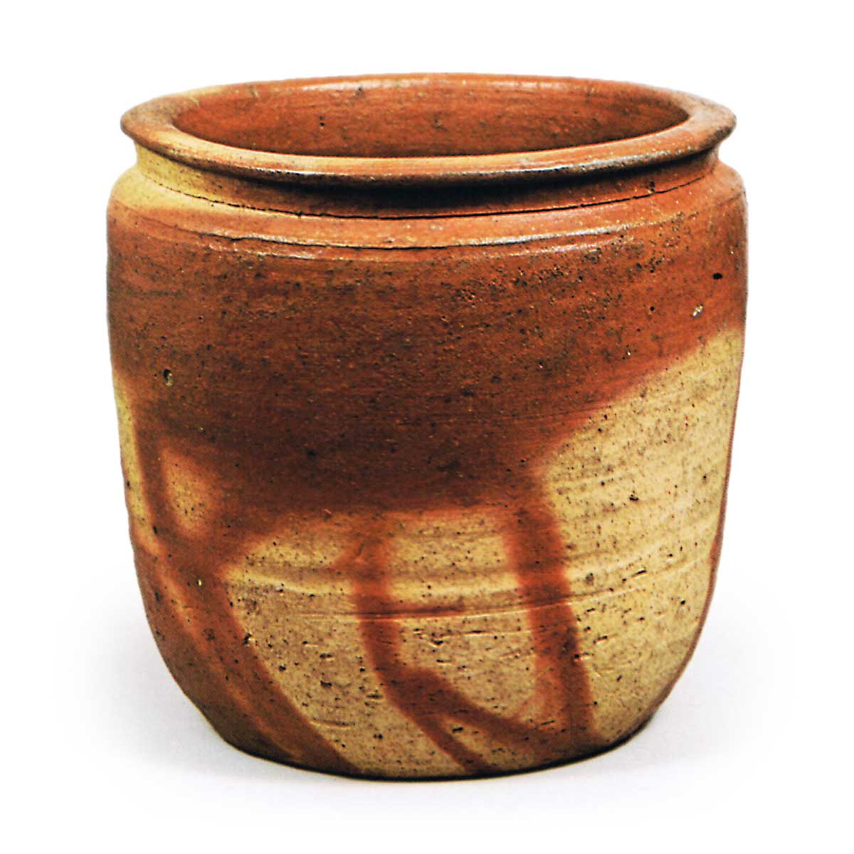 备前绯襷水指 铭 玉柏 备前备前绯襷水指 铭 玉柏 2025.09.092025.11.14 备前绯襷水指 铭 玉柏 高14.9厘米 口径14.2~14.8厘米 底径10.8~11.0厘米 畠山纪念馆虽属种壶风格的水指,却未设耳。口沿向外平直展开,肩部微微外展,向下收束的壶身尤为端庄秀丽,堪称绯襷水指的代表作。素白胎体上,深浅不一的襷纹清晰浮现。平底中央以砧凿技法刻有窑印,铭文“玉柏”,曾为松平不昧公所藏。