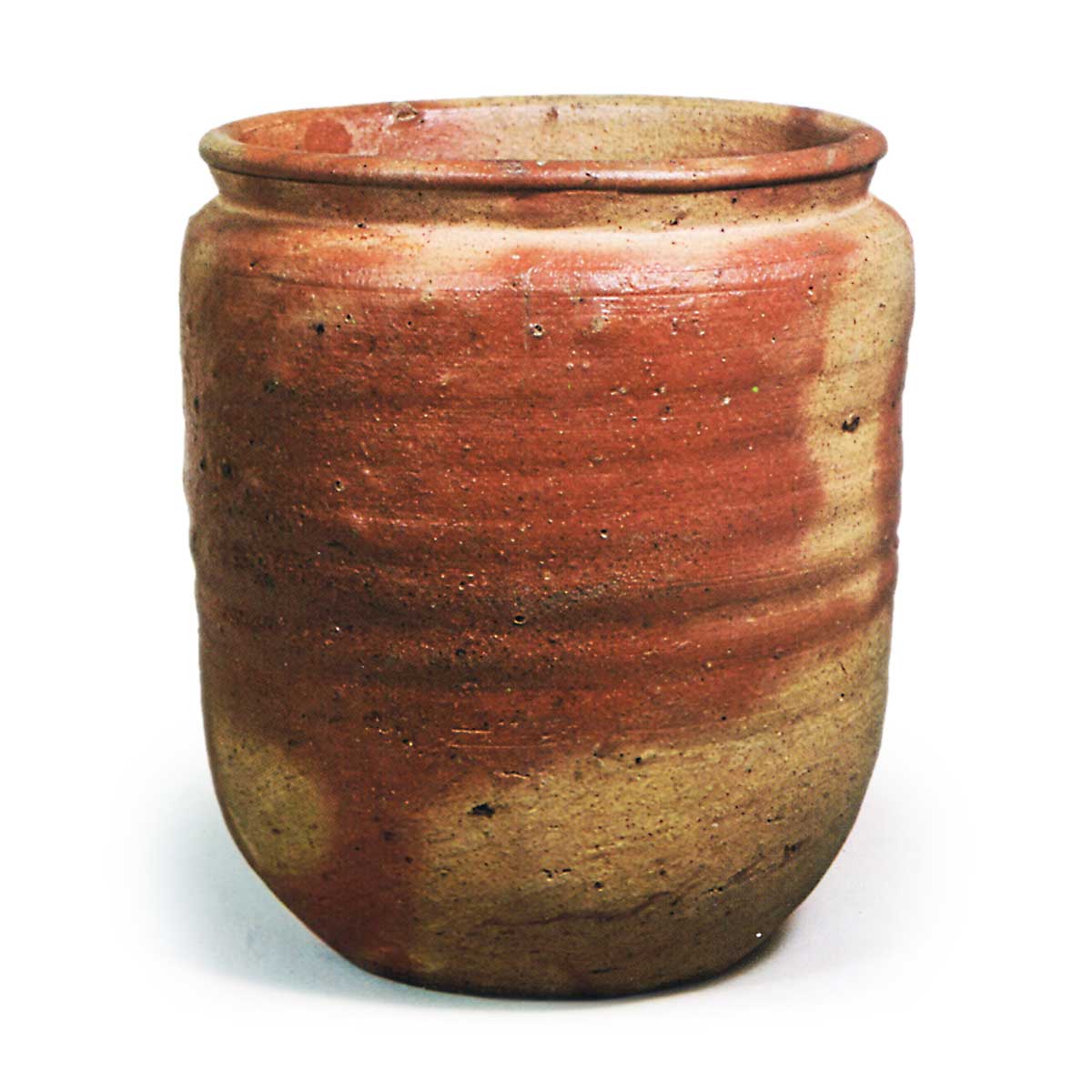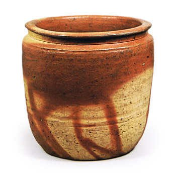 此水指应属种壶风格,但身形略高,整体作风粗犷。口沿呈圆润玉缘状,底部收束有力。白坯略带赤色,绯襷纹路鲜明清晰。内壁亦现绯襷纹。平底处以砧凿技法刻有窑印。