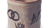 备前绯襷水指 备前备前绯襷水指 2025.09.092025.11.14 备前绯襷水指 高17.0厘米 口径13.7~14.5厘米 底径9.5×9.8厘米此器亦属浑圆质朴之作,口部设阶,裙部外展,乃素雅水指。口内侧与器身饰有两簇硕大的石櫨纹,绯襷纹则以朦胧晕染之法呈现。底面以砧凿刻出窑印。此器亦为松平不昧公旧藏,其匣盖所书当为不昧公亲笔题记。