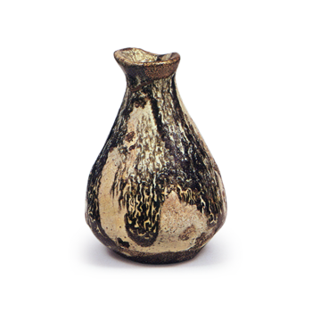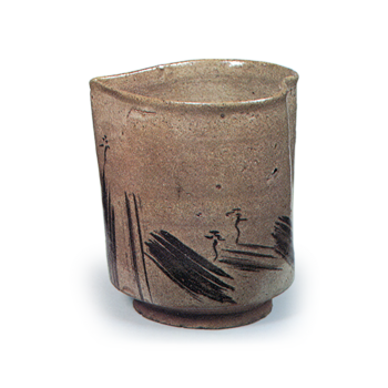备前耳付水指 铭 木叶猿 备前备前耳付水指 铭 木叶猿 X Facebook Hatena Bookmark LINE Pinterest 复制 2025.09.092025.11.14 备前耳付水指 铭 木叶猿 高16.1厘米 口径13.4厘米 左右21.5厘米 底径10.7厘米此器亦属伊部手水指的早期作品。其造型独具一格,口部浅而立起,肩部强劲上挑,器身向下收束,高台低矮削制。肩部两侧附有环形耳柄的设计尤为别致。自口部至肩部薄施胡麻釉,胴体半面亦覆胡麻釉,局部呈现胎肌质感。口沿附着窑渣形成独特景致。器身题有“木叶猿”铭文,堪称伊部手水指中自古流传的名品。