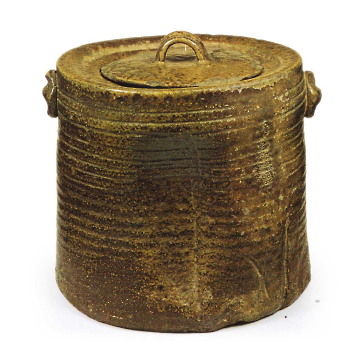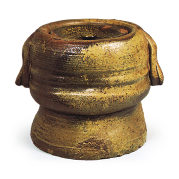 备前耳付水指 备前备前耳付水指 X Facebook Hatena Bookmark LINE Pinterest 复制 2025.09.092025.11.14 备前耳付水指 高18.2厘米 口径14.3厘米 左右19.2厘米 底径17.5厘米筒形水指,口部呈浅弧形下陷。肩部下方左右两侧附有粗犷的耳柄,器身环绕着细密的线状雕刻纹样。整体略显厚重,此类水指应为庆长至元和年间作品。器身下缘饰有笤帚纹雕刻,底面刻有窑印。