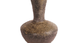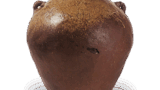 备前耳形袋状水指 备前备前耳形袋状水指 2025.09.092025.11.14 备前耳形袋状水指 高15.5厘米 口径20.4厘米 胴径19.8厘米 底径12.7厘米此为袋形水指的代表作,通过压制器身一侧形成变化,两侧配有宽大的耳形把手。自口部至肩部厚厚地覆盖着胡麻釉,涂土的胎体烧制成黑褐色。底面以笤帚刻法刻有窑印,盖内侧亦刻有浅浮雕窑印。上述水指皆属所谓伊部手水指。伊部手整体而言并非古作,普遍推测为庆长至元和、宽永年间作品,但其中亦存在可称为初期伊部手的古作。然而伊部手水指多具夸张异形特征,与窑变所致的所谓古备前水指在制作风格上存在显著差异。