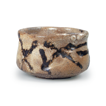 据传为利休所藏的花生,其器形极为罕见。整体呈三角造型,上部两侧开有方形窗格。虽与利休偏爱的竹形花生等器物风格相近,但双面开窗的设计尽显独特创意。烧肤质近似室町时期器物,釉色单一,整体呈现深黑色。藏箱内有记载为利休所藏,应可视为利休偏爱的器型。