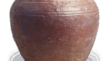 备前擂座花生 备前备前擂座花生 2025.09.09 备前擂座花生 高29.2厘米 口径10.7厘米 底径12.9~13.6厘米此为造型稳健的裾张形大型花生,器身三面经强力压制形成纵向筋纹,器身裾部环绕横向笤帚纹。喇叭状口沿饰有八枚扑擂纹。釉色与室町后期作品相近,此类花生应属古作范畴。底施梳状窑印。整体呈暗褐色烧结,釉色素净。根津美术馆藏有作风相似的同类器物。