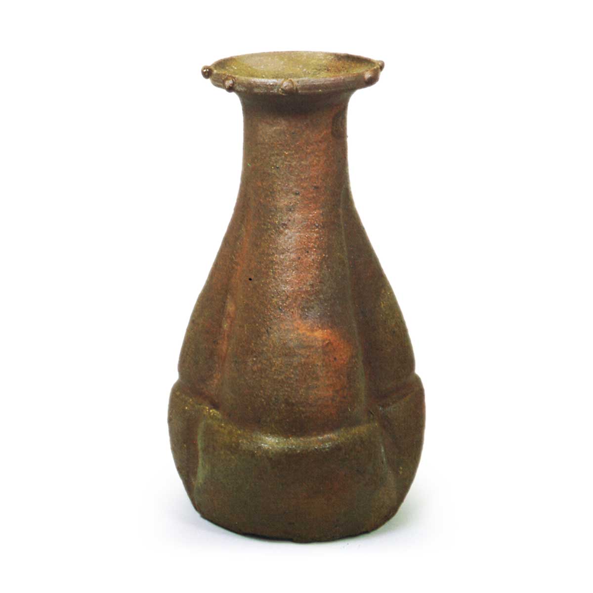 此为造型稳健的裾张形大型花生,器身三面经强力压制形成纵向筋纹,器身裾部环绕横向笤帚纹。喇叭状口沿饰有八枚扑擂纹。釉色与室町后期作品相近,此类花生应属古作范畴。底施梳状窑印。整体呈暗褐色烧结,釉色素净。根津美术馆藏有作风相似的同类器物。