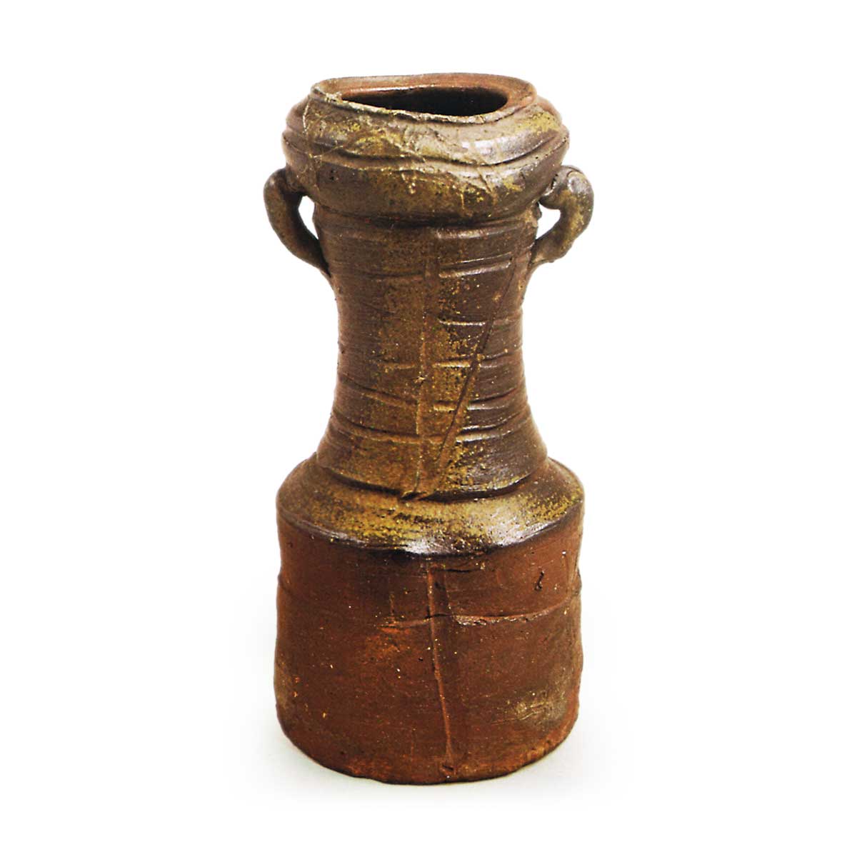 备前耳付花生 备前备前耳付花生 2025.09.09 备前耳付花生 高28.4厘米 口径8.0厘米 胴径13.2厘米 底径13.7厘米此为柑子口砧形花瓶的变体,造型颇具力度,然景致略显单薄。颈部纵横交错饰以砧形纹,瓶身亦刻有强劲的纵砧纹与横砧纹各一道。自口部至肩部覆有胡麻釉,瓶身则烧制成赤红色。