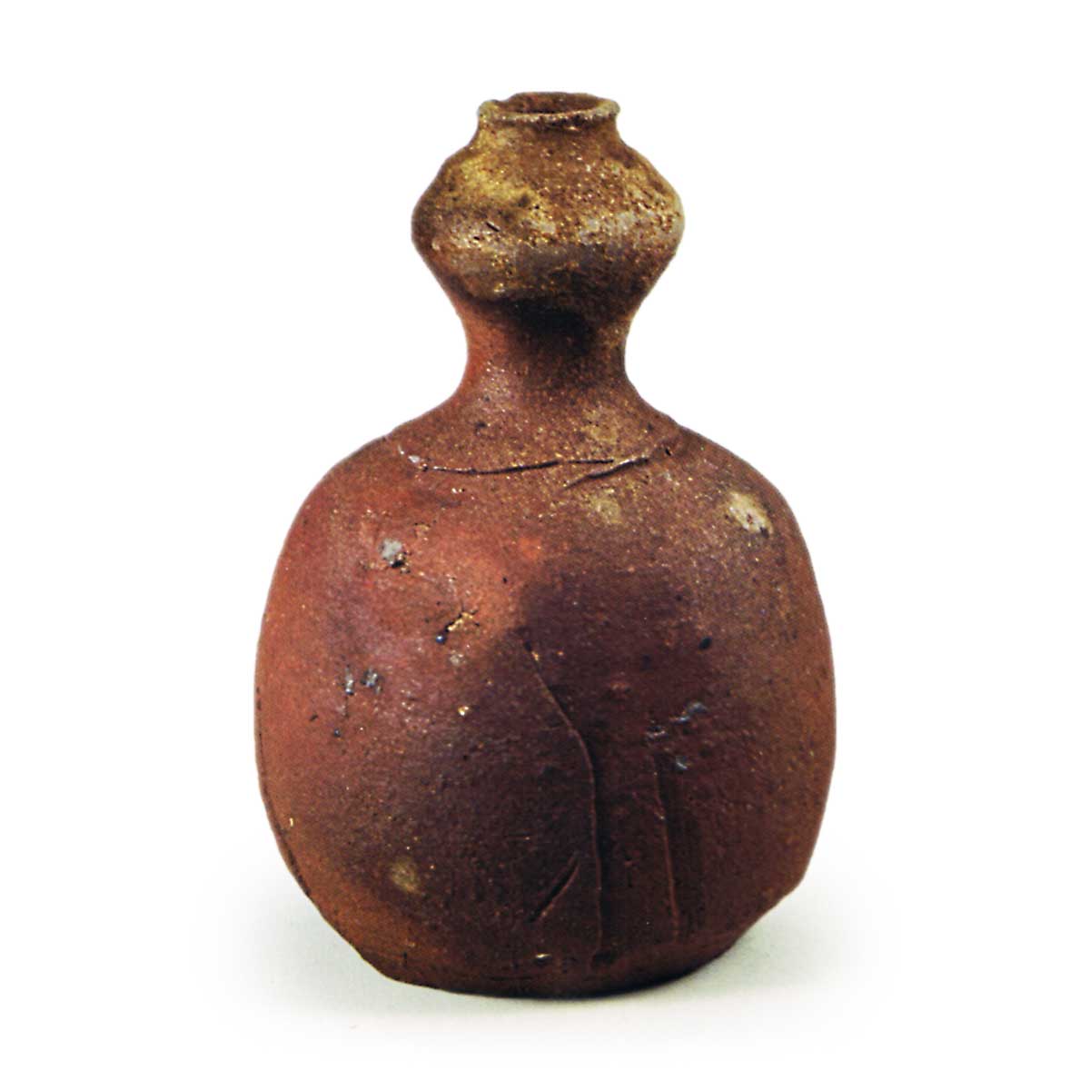 备前瓢形振出 备前备前瓢形振出 2025.09.09 备前瓢形振出 高12.1厘米 口径1.9厘米 胴径8.3厘米 底径5.6厘米此为小型酒壶,现用于振出。器形上小下大,浑圆饱满,造型灵动。胴体上部饰以筅纹,底部边缘亦施纵向筅纹。高台呈圆形,边缘留有褶皱状胎土,中央经削刻处理,底面刻有铭文。口部及胴体局部附着薄灰釉,其余部分呈现柔和的红色窑变效果。