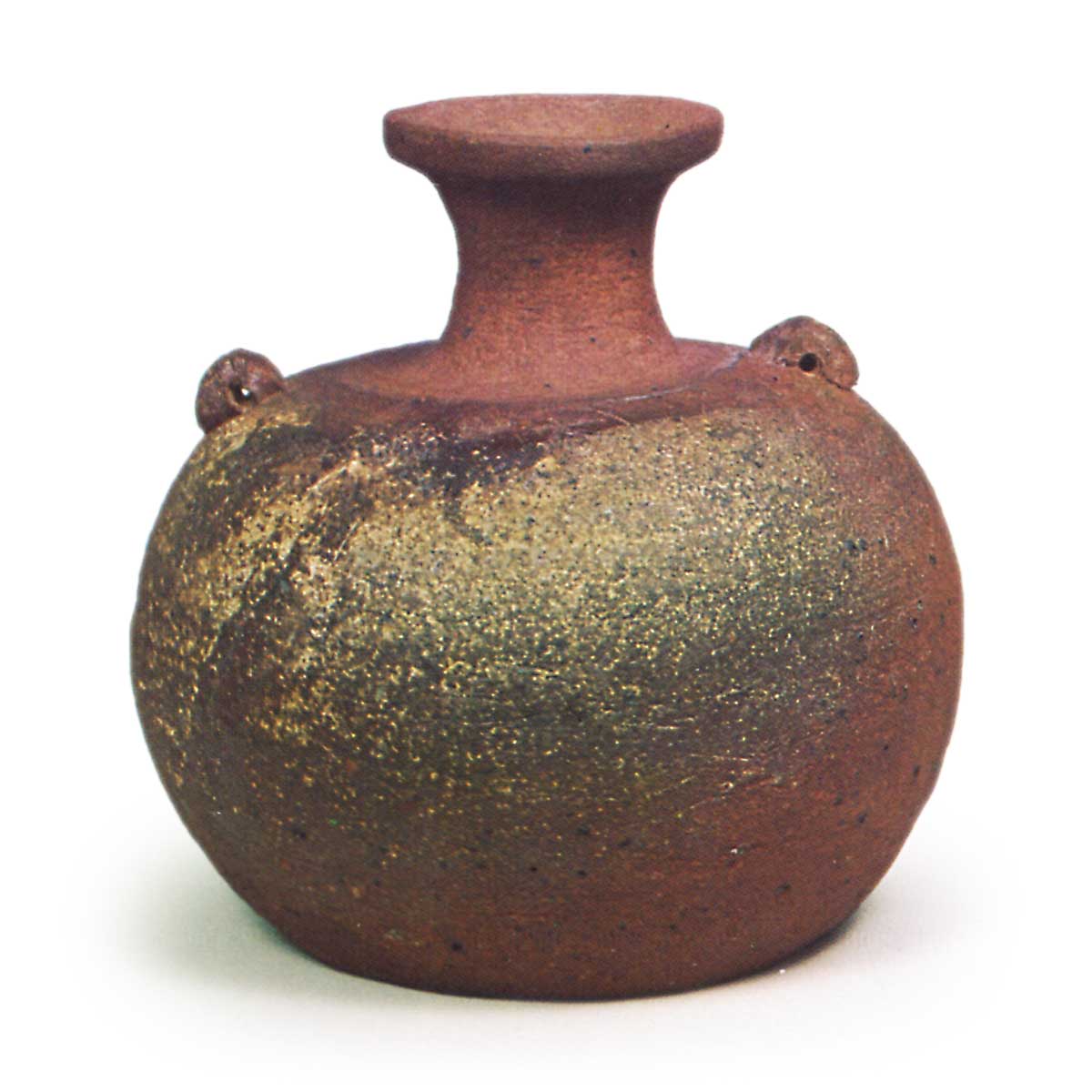 备前耳付振出 备前备前耳付振出 2025.09.09 备前耳付振出 高9.8厘米 口径3.9厘米 胴径9.8厘米 底径6.1厘米此为喇叭状口沿、胴身丰盈饱满的小型酒壶,如今亦被用作振出壶。肩部两侧附有小耳,整体造型应属朴实之作。口部似曾有器物覆盖,颈部至肩部呈素烧质地,肩部至器身下缘有灰釉附着,其中一侧呈现赤色素烧效果。肩部有窑印但已模糊不清,平底处则以砧凿技法刻有窑印。