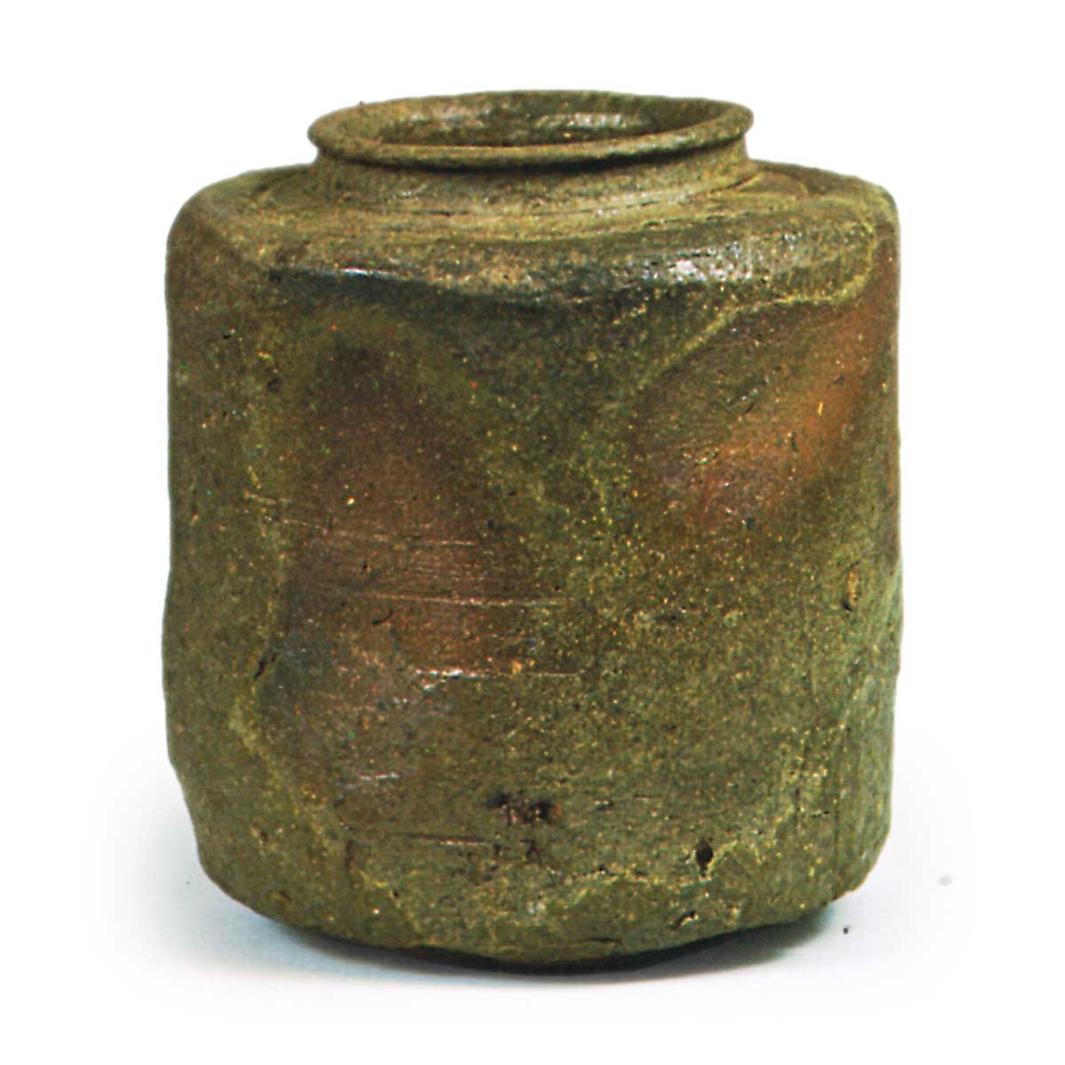 备前肩冲茶入 铭 千岁 备前备前肩冲茶入 铭 千岁 2025.09.092025.11.14 备前肩冲茶入 铭 千岁 高7.4厘米 口径3.8厘米 底径3.7厘米肩冲形茶入,口部圆润扭反,胴体呈裙摆状向上延伸。腰部不规则削削,底呈椭圆形。将胴体四面处理,每面刻有一至两道纵向笤帚纹以增添变化。釉色沉郁呈现窑变,胴体两侧泛红,其余部分为灰青色的砂砾肌理。底侧施有窑印,据传为新兵卫所作。