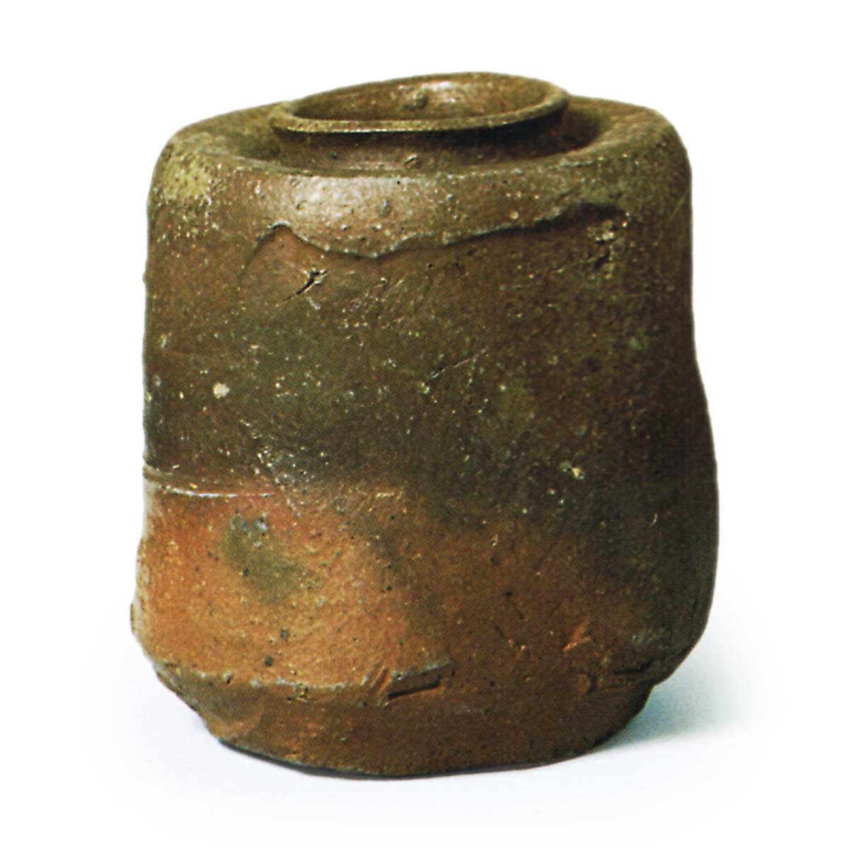 备前肩冲茶入 备前备前肩冲茶入 2025.09.092025.11.14 备前肩冲茶入 高6.6厘米 口径3.3厘米 底径4.7厘米 东京国立博物馆此为肩冲形茶入,小巧的口部略呈下陷。胴体带有凹痕,胴底边缘环绕着清晰的切面笋纹。器身上部亦饰以横向笋纹,堪称笋纹工艺精湛的茶罐。自肩部至罐身薄施胡麻釉,罐底边缘局部露出赤红柔润的素胎。平底处压有窑印。