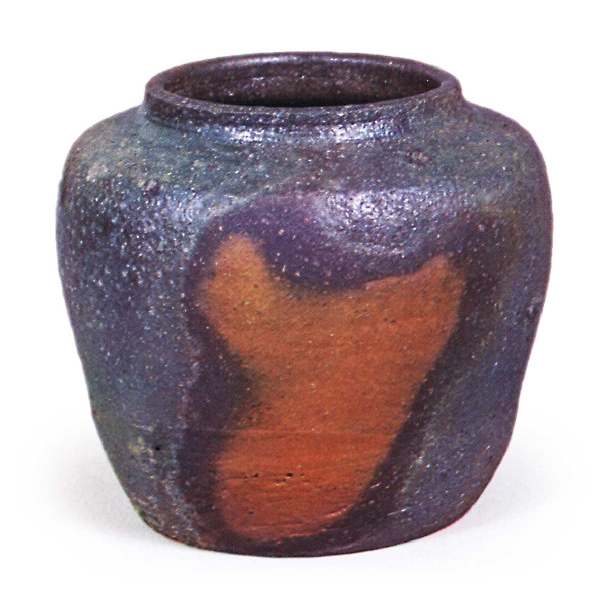 此壶形茶罐作风质朴,肩部外展,底部收束。整体厚实成形,壶身三面呈现大小不一的红色釉斑,其余部分则呈现青黑窑变的鲜明色调。底面刻有笤帚形窑印,据此类茶罐特征判断,应属较古老器物。
