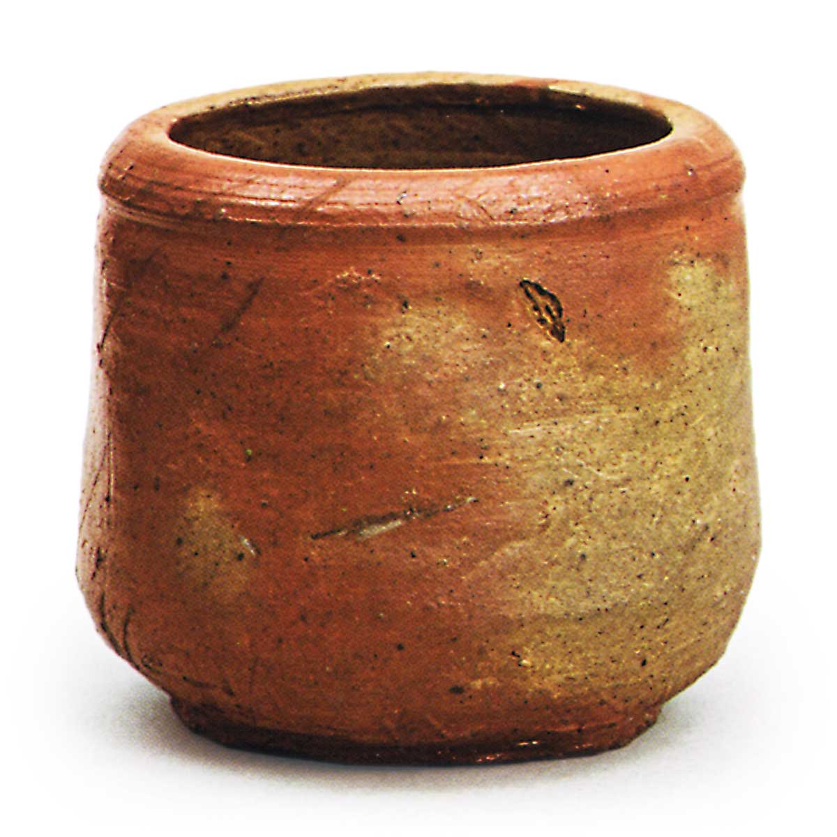 备前绯襷香炉 铭 得意 备前备前绯襷香炉 铭 得意 2025.09.09 备前绯襷香炉 铭 得意 高7.8厘米 口径6.5厘米 胴径7.8厘米 底径6.2厘米此器应为香炉所制,亦可能是焚香容器。口部微内收,器身向外张展,高台呈圆座状。自口部至胴体中段泛红,其余部分烧制成素白。腰部饰有与伊贺烧极为相似的压纹纹样,颇为有趣。底面留有窑印。