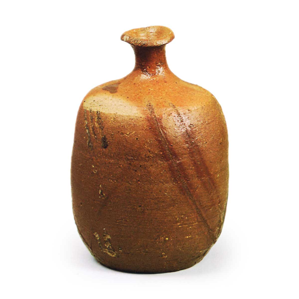 备前绯襷德利 备前备前绯襷德利 X Facebook Hatena Bookmark LINE Pinterest 复制 2025.09.10 备前绯襷德利 高12.0厘米 口径2.6厘米 胴径8.2厘米 底径5.5厘米 畠山纪念馆肩部至裙边施有涂土,烧成褐色,自口部至胴身呈现绯襷纹样。颈部略有歪斜,然此类酒壶中仍属精品。胴身裙边刻有窑印,底面留有稻草痕迹。
