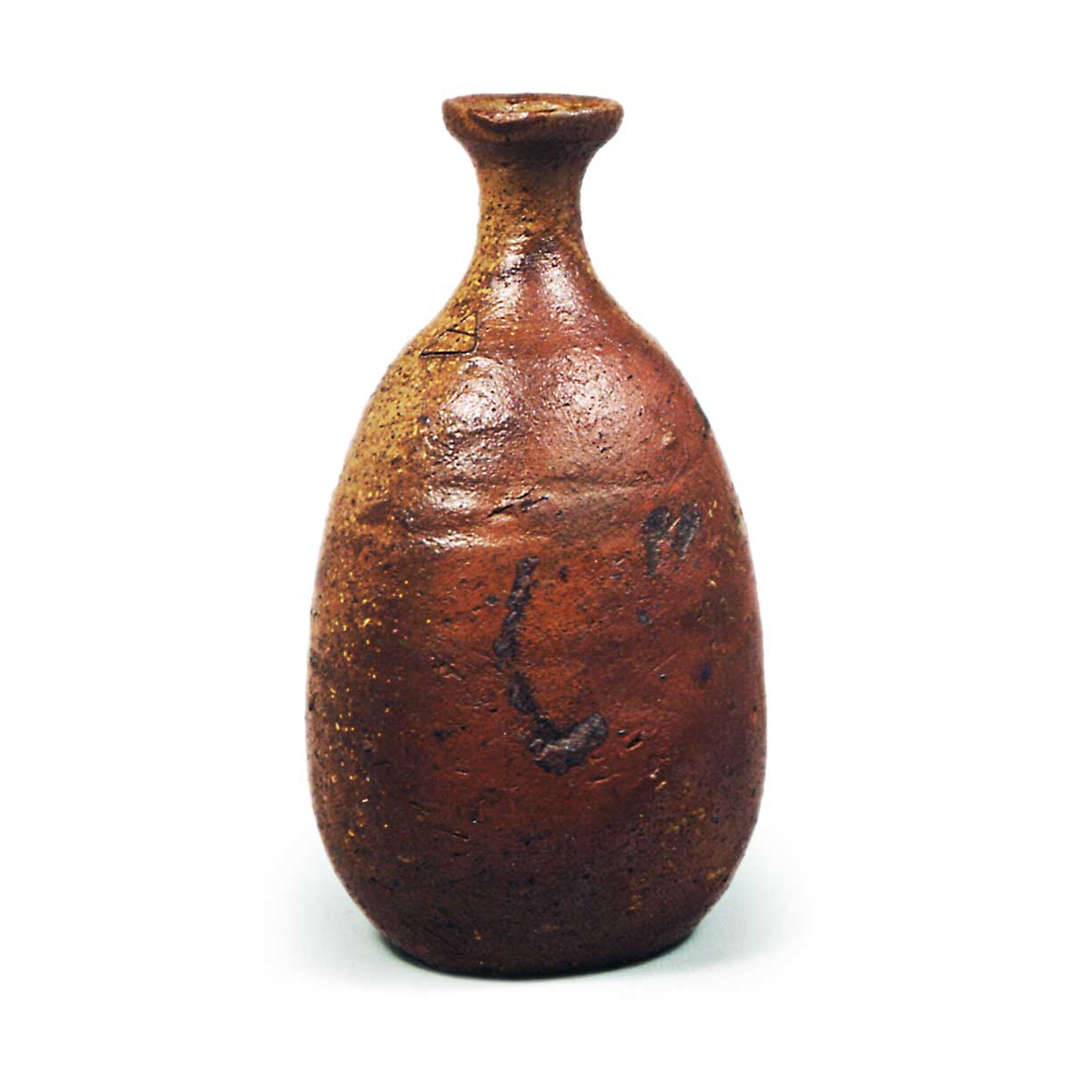 备前德利 备前备前德利 2025.09.10 备前德利 高19.4厘米 口径3.9厘米 胴径11.0厘米 底径6.8厘米此为略显硕大的辣韭形德利,堪称此类器型中的杰作之一。从抚摸般的肩部至胴身,其膨胀感自然流畅,尽显温润气质。自瓶口至瓶身下缘,一侧覆有芝麻釉,另一侧则显露赤褐釉胎。底面留有刮凿痕迹,与瓶身连接处残存粘连印记,略呈凹陷。肩部刻有窑印。
