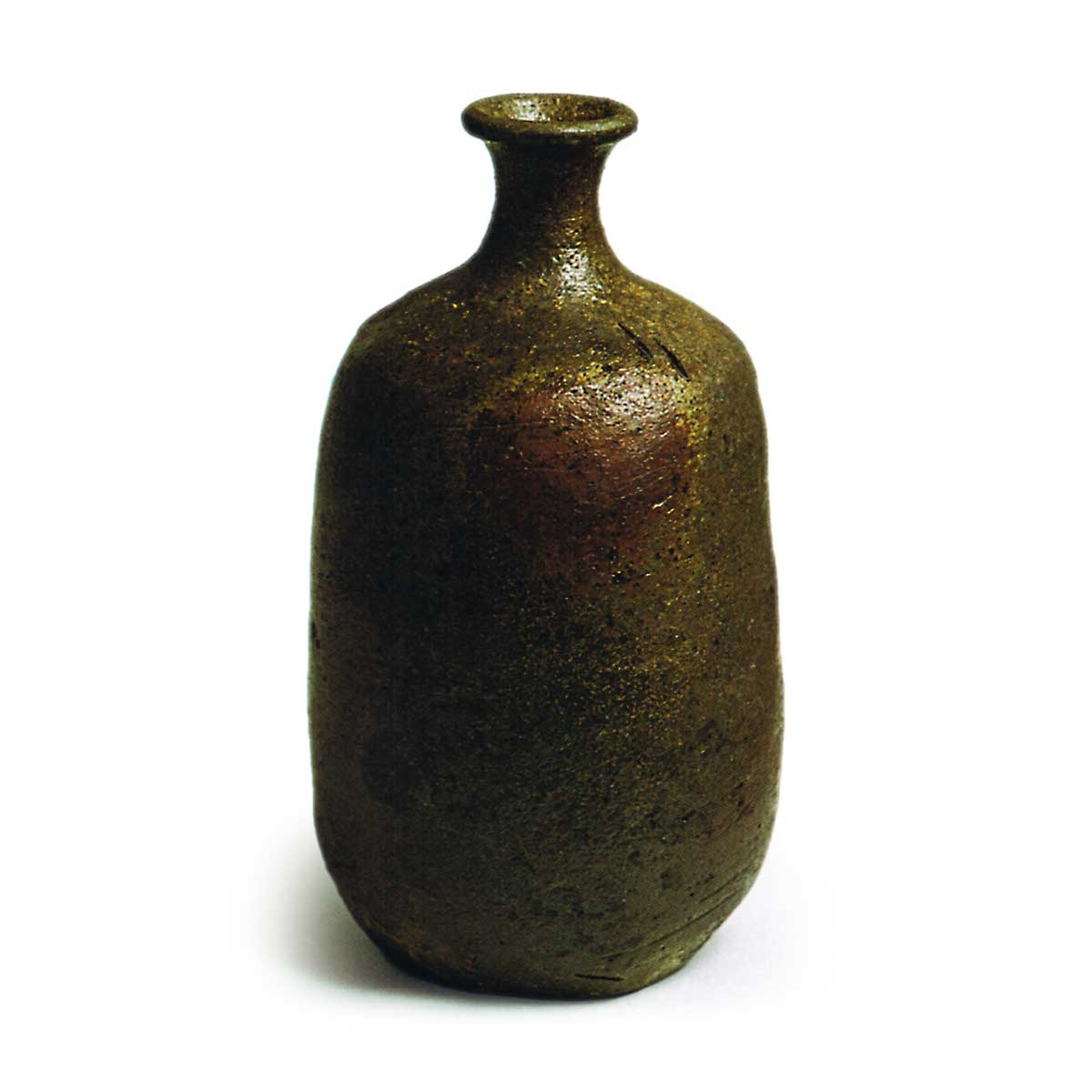备前德利 备前备前德利 2025.09.10 备前德利 高17.6厘米 口径3.5厘米 底径6.7厘米肩部外张的德利,瓶身下缘同样经刮刀处理收窄。肩部一处、胴身一处出现红色釉色脱落,其余部分覆盖灰釉呈现略显暗沉的色调。作为窑变手绘德利,堪称极具韵味之作。肩部以刮坯技法刻有窑印。