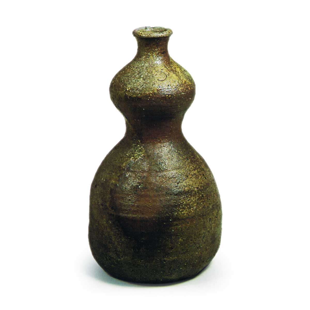 备前瓢形酒壶 备前备前瓢形酒壶 X Facebook Hatena Bookmark LINE Pinterest 复制 2025.09.10 备前瓢形酒壶 高21.5厘米 口径3.4厘米 底径8.6厘米此为罕见的葫芦形酒壶,裙部丰盈外展,姿态稳重。因体量稍大,亦可作花生瓶使用。自壶口至肩部、壶身遍布灰釉,局部隐约透出赤色胎土,颇具韵味。肩部上方刻有窑印。