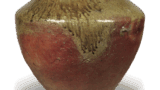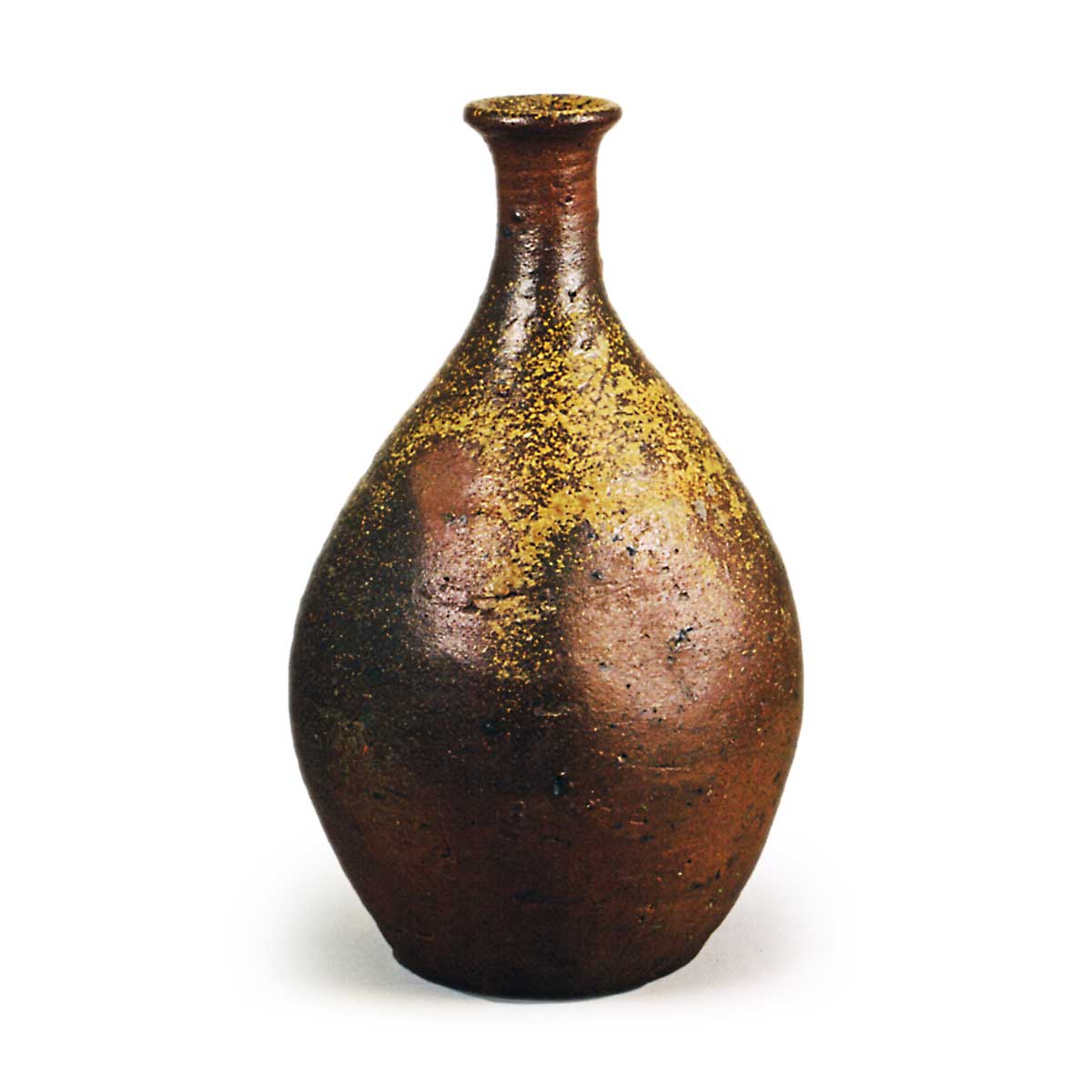 备前德利 备前备前德利 2025.09.10 备前德利 高25.6厘米 口径4.6厘米 胴径15.3厘米 底径9.6厘米 冈山县立博物馆此为大型辣韮德利,器身略显饱满。颈部至胴部覆有芝麻釉,其余部分呈柔和的赤色烧成。肩部刻有线刻窑印。