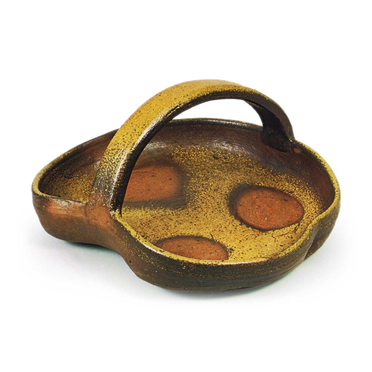半月形手盆底矮侧高,弓形把手横跨其上。两侧施以笤帚纹雕刻并略作扭曲,粗犷的制作手法颇具韵味。盆面三处剥落处鲜明可见,倾泻的胡麻釉色明亮,最终形成湿润润泽的釉面。平底三方附有小足,底心处以细砧雕刻着窑印。