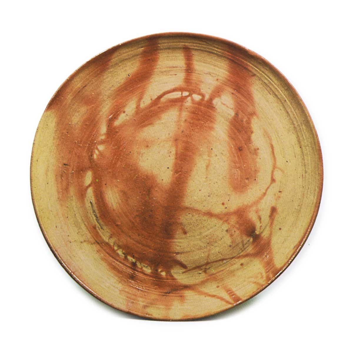 备前绯襷盘 备前备前绯襷盘 2025.09.11 备前绯襷盘 高3.6厘米 口径25.2×25.4厘米 三足 畠山纪念馆绯襷纹平盘实属罕见。盘身薄而端正,经轆轤拉坯成型,底部三方附有支足。盘面呈现晕染般的绯襷纹样,胎体洁白且烧制致密。