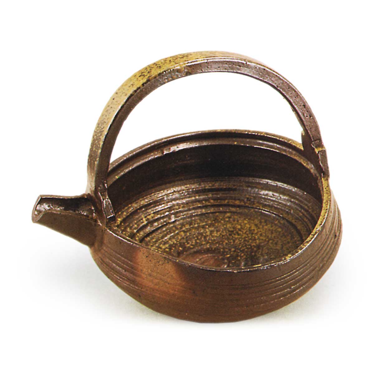备前酒壶 备前备前酒壶 2025.09.11 备前酒壶 高16.1厘米 口径16.0×19.0厘米 底径11.3厘米此类为口径宽大的酒壶,应属烂锅之列。其宽口处设有阶梯状台阶,均配有弓形把手。虽刻有印记,但制作风格极为相似。外侧饰有线状雕刻亦属同类特征。壶身内壁存在微小缺损,芝麻釉层薄而均匀。