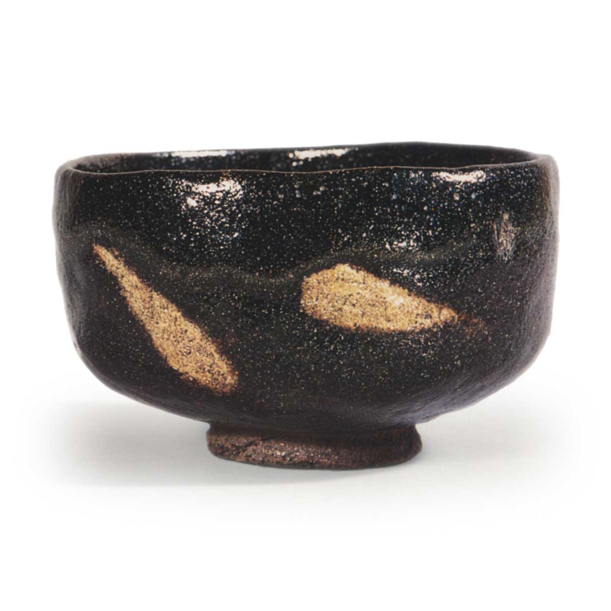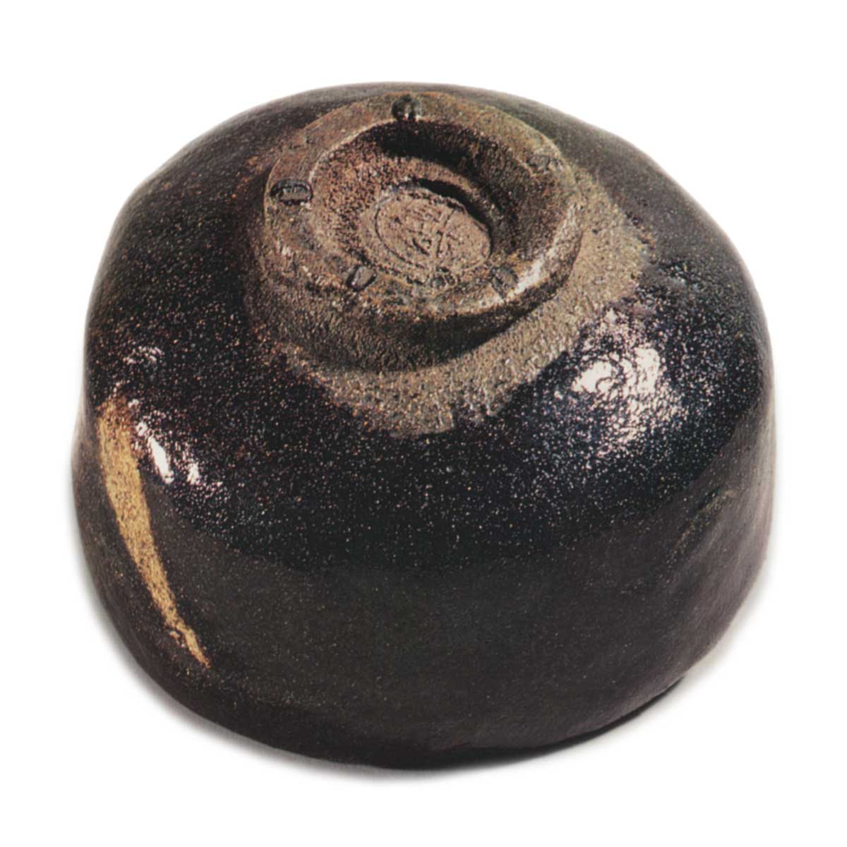 整件作品表面覆盖着一层带有焦糖色的黑色釉,内外都覆盖着漂亮的亮釉,这是浓香的特色,非常华丽。外侧有两个黄色的斑点,看起来像芦苇,让人联想到日本鸻。边缘附近还有一些擦痕。