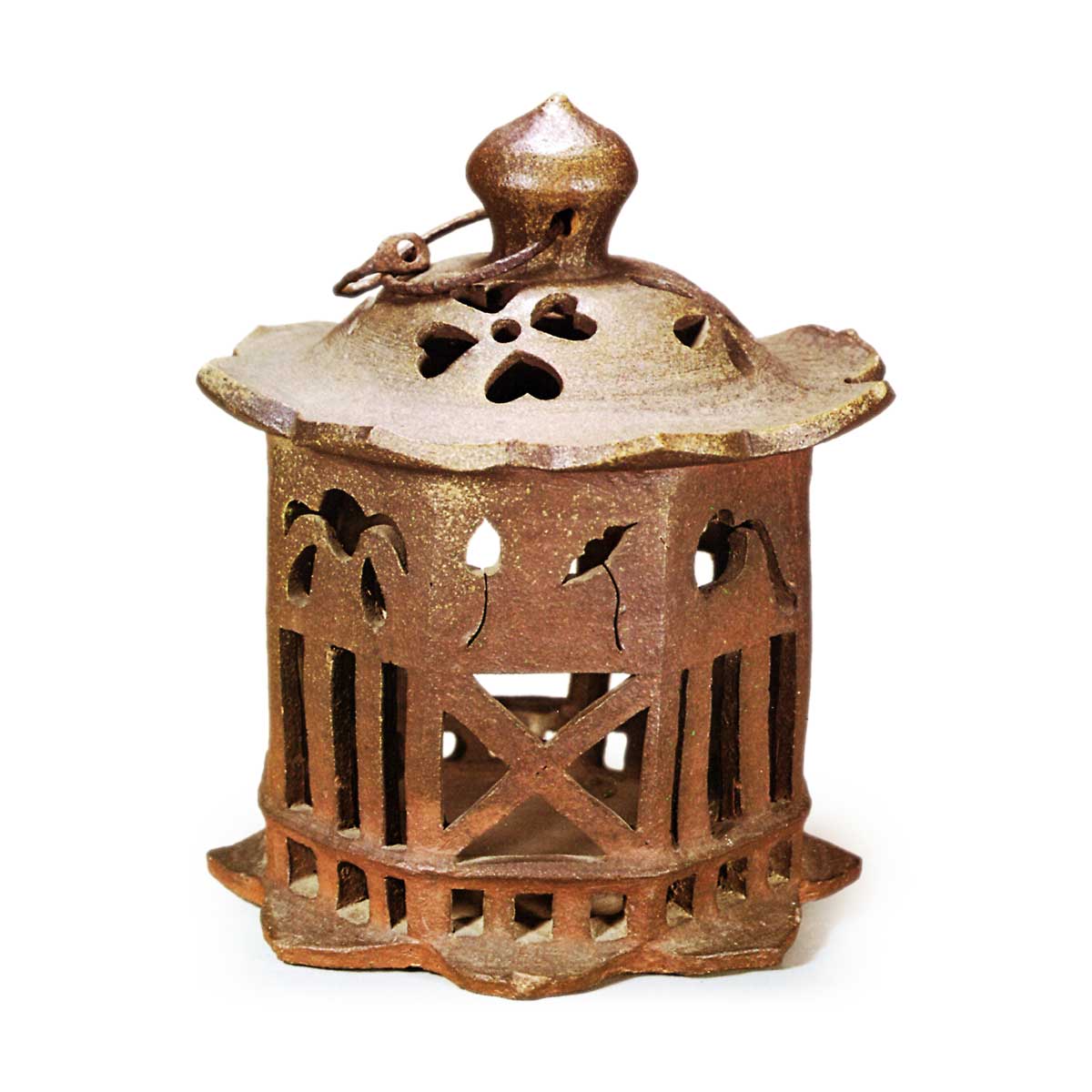 备前透文吊灯笼 备前备前透文吊灯笼 X Facebook Hatena Bookmark LINE Pinterest 复制 2025.09.11 备前透文吊灯笼 高27.9厘米 宽24.5厘米顶盖与底座均呈花形,顶盖透雕酢浆草等纹样,侧面亦透雕莲花莲叶,裙边饰以格栅。其透雕切痕锋利有力,堪称造型精妙的吊灯笼。更难得的是底面刻有“元和五年卯月吉日 木村二郎介”铭文,确证了制作年代,实属珍贵之作。其作风尚存庆长时期韵味,若无铭文,人们多半会将其误认为庆长时期的作品。此乃世间罕见的杰作。