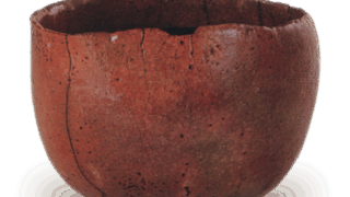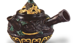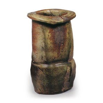 这件花器堪称伊贺烧非凡美感的象征。外展的罗式口沿内收成聚口,颈部收束后两侧配耳,六角切面的器身在底部饰以篾条勾勒轮廓。烧制过程中口部开裂缺损,碎片散落于颈部与胴体,其中一片三角状残片附着于胴体上部,形似尖刺,故得名“棘花瓶”(からたち)。从口部至胴身覆盖着厚厚的薪灰,上部形成灰黄色与局部草绿色的釉面,下半部则呈现焦黑的暗绿色与紫黑色。伊贺地区此类灰釉器俗称“玻璃釉”,因属自然柚木釉,故自器身底部至底缘未施柚木釉,褐色焦土胎体意外地烧得柔软致密。颈部表里两侧的填釉孔均已填补。此器原为加贺前田家传世之物。