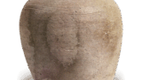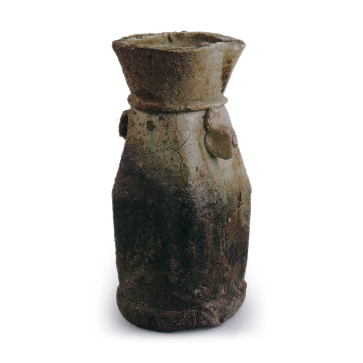 与「芙蓉」同为整体厚实造型,自口沿至器身底缘呈抚四方形,此类作风实属罕见。收束的颈部根部饰以环状纹样,倾斜的肩部两侧随意垂挂着独特的耳形把手——“寿老人”之铭想必正是源于此耳。厚实的圆座状底座出现窑裂,背面自口部至肩部呈现不规则焦痕,器身亦可见圆形红焦斑。正面自口部至器身覆盖浅嫩草绿色的灰釉,下半部釉层厚重,部分器底积釉,暗紫黑色焦痕下显露青绿玻璃釉。此花器颈根处亦留有穿孔填补痕迹。