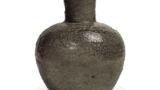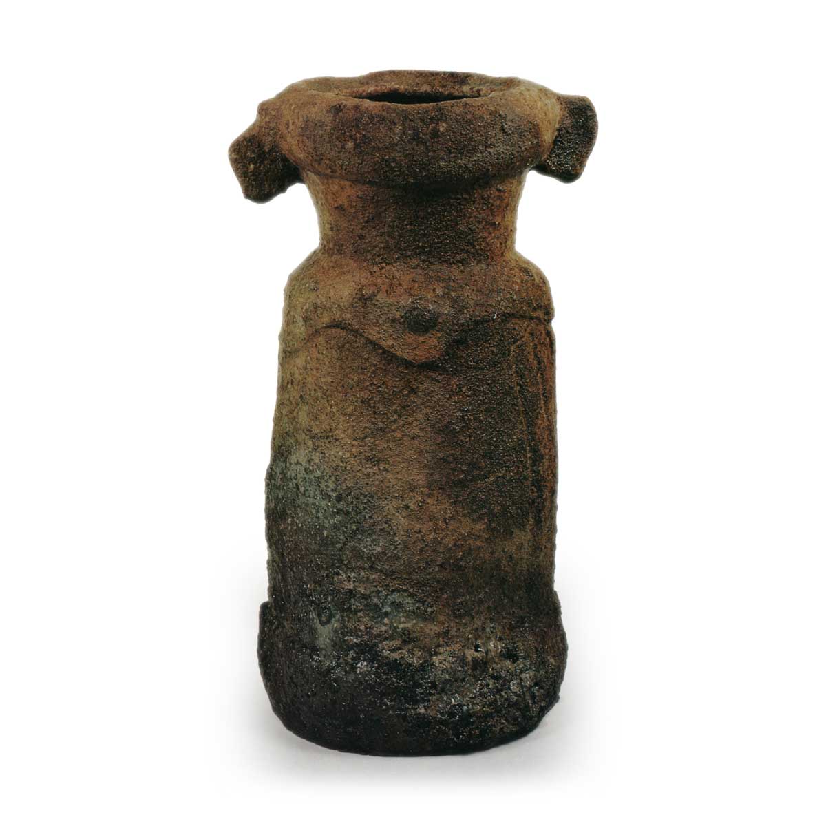 俗称唐犬耳,是口部两侧饰有方形耳饰的罕见花器。口沿内收,肩部圆润外展,器身微张渐收至器底,由厚实底座承托。肩部下方饰有山路状起伏的深笤帚纹,胴体两侧刻有单条或双条浅纵向笤帚纹,背面则清晰留有一道似指痕的粗纵纹,胴体底部亦环绕着深邃的横向笤帚纹。表面覆盖着厚重而剧烈的灰烬,上部呈暗褐色焦痕,左下半部显露出暗绿青色的釉面,其形态宛如苔藓覆盖的岩壁。背面则截然不同,呈现无釉的淡褐色焦痕,仅裙边处呈现黑色变化。底面为平底,存在窑裂痕迹。此处肩部亦留有填补钦附孔的痕迹。