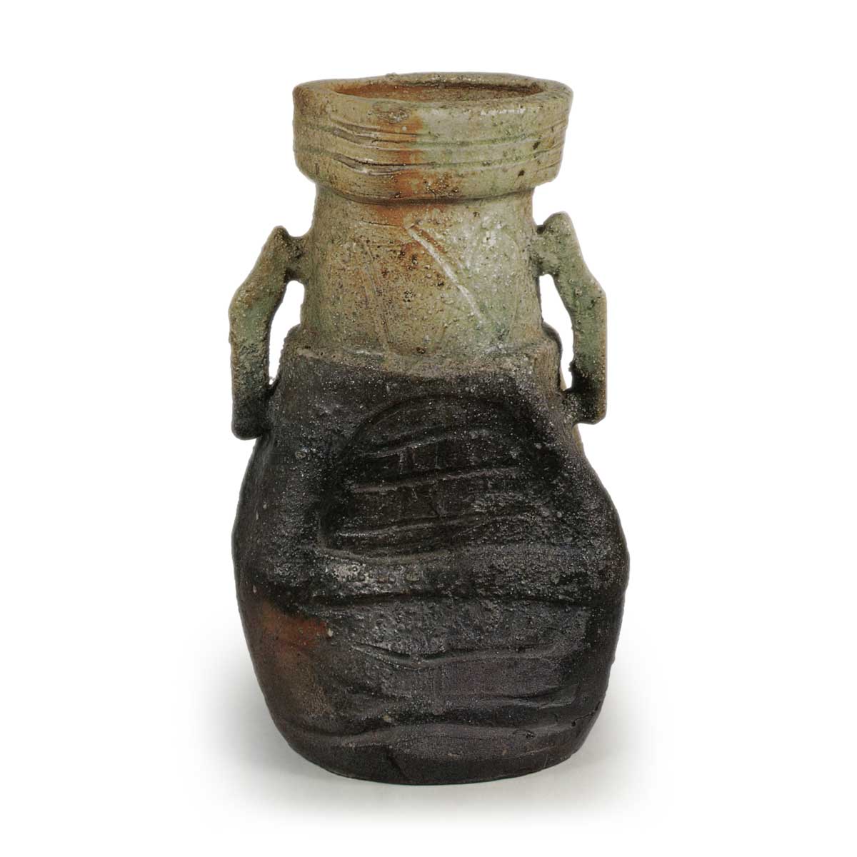其造型堪称奇特。口部高耸上扬,口沿微微内收;颈部粗壮,胴体中部丰满而底部收束。正面饰以圆形与格子状的笋雕纹样,背面刻有清晰的横向直纹,颈部环绕着檜垣纹。从器首延伸至胴部的双耳造型中途弯折,更添趣味,实为奔放不羁的花器杰作。器身上部正面泛淡绿色柚色釉,背面呈焦红色,下半部整体焦黑或紫褐色,自器底至底部的胎体质地柔软,烧结紧密。胴体处出现两处大窑裂,底面中央一处。背面留有钦印。