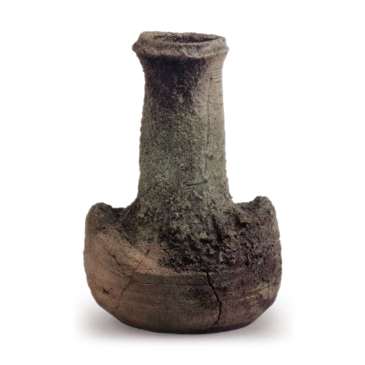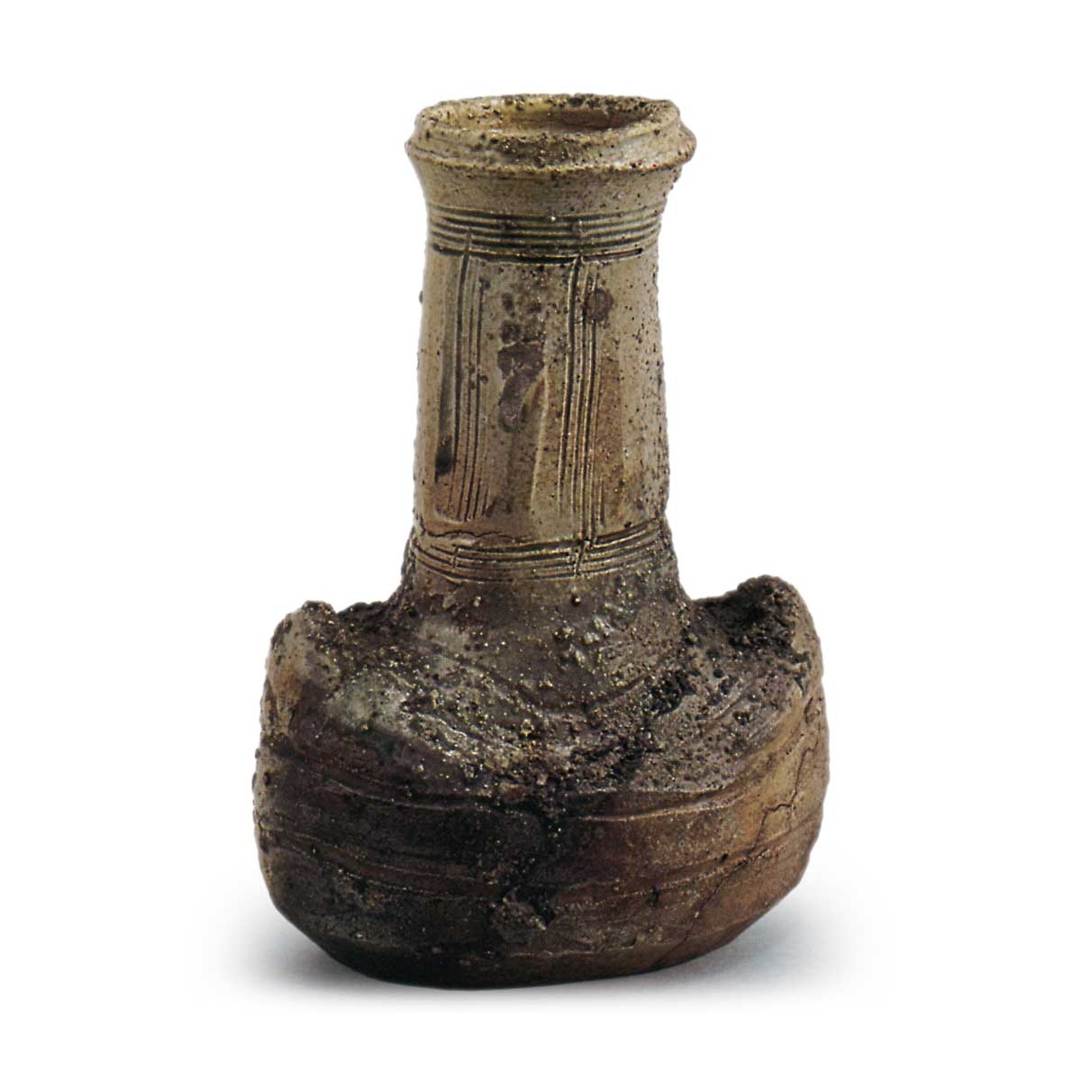 伊贺花器 铭长郎 伊贺伊贺花器 铭长郎 2025.09.11 伊贺花器 铭长郎 伊贺花器 铭长郎 高27.5厘米 口径8.0厘米 左右19.0厘米 底径9.0×13.8厘米此器亦是出人意表的造型。从两侧外延的舟形扁平胴体上,高耸起修长的颈部,口沿采用室町时期壶器常见的阶梯状构造。器底边缘经刨刀处理呈倒角状,平坦的底面呈现椭圆形态。正面从口部至胴体覆盖着厚重的灰釉,宛如苔藓般的景致;背面则呈现淡红焦痕肌理。器身右半部显露出柔软烧结的陶土肌理,并出现两道窑裂纹。颈部上下环绕五道梳纹,四面饰以两道纵纹。“长郎”铭文应是捕捉了颈部蜿蜒的形态特征。此作在桃山时期的伊贺花器中亦属古雅格调之作。
