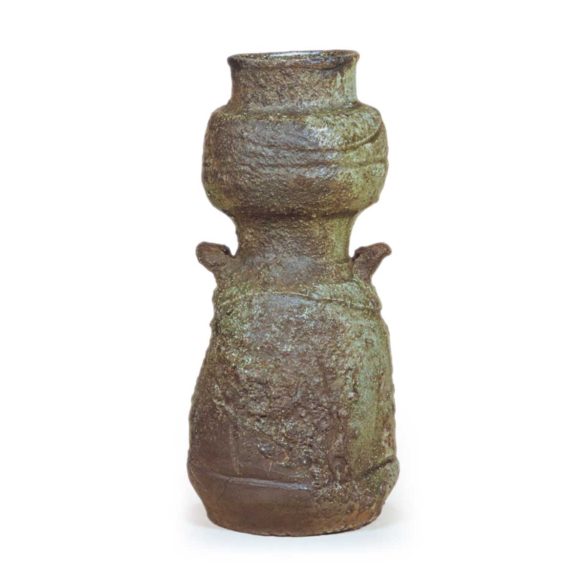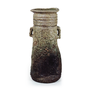 伊贺带耳瓢形花瓶 备前伊贺带耳瓢形花瓶 X Facebook Hatena Bookmark LINE Pinterest 复制 2025.09.11 伊贺带耳瓢形花瓶 高27.9厘米 口径7.7厘米 底径10.3厘米此为伊贺特有的葫芦形花器,器身上部圆润,底部渐次舒展。紧凑的器身两侧饰有角状耳柄。整体厚实成形,质感厚重,在伊贺烧花器中堪称古雅典范。器底边缘的胎土质地柔和,烧制得紧实。自口沿至裙口处剧烈飞溅的灰釉形成玻璃釉效果,背面则呈现赤褐色烧结质地。器身上部饰以环形纹理,下部则施以山路状刮痕纹与纵向刮痕纹。