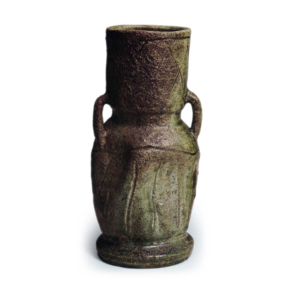 伊贺耳付花器 铭:寿老人 伊贺伊贺耳付花器 铭:寿老人 2025.09.11 伊贺耳付花器 铭:寿老人 高28.4厘米 口径9.8×10.3厘米 左右13.5厘米 底径11.7厘米根津美术馆颈部呈直线造型,膨胀的器身三面收束,底部制成圆座状,两侧配有细长管状耳。器首饰以线刻桧垣纹环绕,胴身饰有山路状横梳纹与纵筋纹。正面自然釉厚重垂落,局部呈青色,局部烧成暗绿焦釉肌理,背面则烧成赤色紧釉。底面有三个釉流相连,背面刻有纹章。
