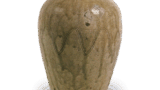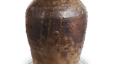 伊贺耳付花器 铭林和靖 伊贺伊贺耳付花器 铭林和靖 2025.09.11 伊贺耳付花器 铭林和靖 高29.1厘米 口径8.4~9.2厘米 底径14.2~13.5厘米京都民艺馆器形略显粗短,厚实成型,整体沉稳厚重。底缘如往常般呈圆座状加厚处理,两侧附有耳柄,器身饰有九道纵向刨痕。表面左侧曾遭剧烈灰烬覆盖,形成玻璃粉状残留,局部有焦灼痕迹。器底边缘整体呈现黑色焦痕,背面至右侧区域则呈现红色烧结痕迹,自器首至器身有两道琥珀色釉粉流淌。器底题有“林和靖”铭文。