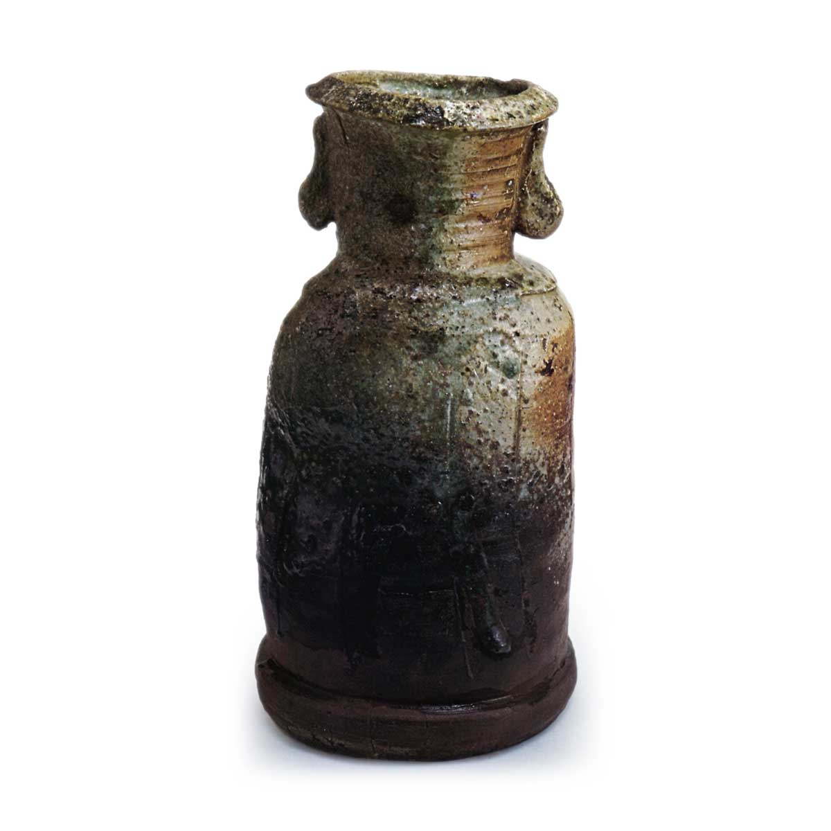 伊贺耳付花器 铭林和靖 伊贺伊贺耳付花器 铭林和靖 X Facebook Hatena Bookmark LINE Pinterest 复制 2025.09.11 伊贺耳付花器 铭林和靖 高29.1厘米 口径8.4~9.2厘米 底径14.2~13.5厘米京都民艺馆器形略显粗短,厚实成型,整体沉稳厚重。底缘如往常般呈圆座状加厚处理,两侧附有耳柄,器身饰有九道纵向刨痕。表面左侧曾遭剧烈灰烬覆盖,形成玻璃粉状残留,局部有焦灼痕迹。器底边缘整体呈现黑色焦痕,背面至右侧区域则呈现红色烧结痕迹,自器首至器身有两道琥珀色釉粉流淌。器底题有“林和靖”铭文。