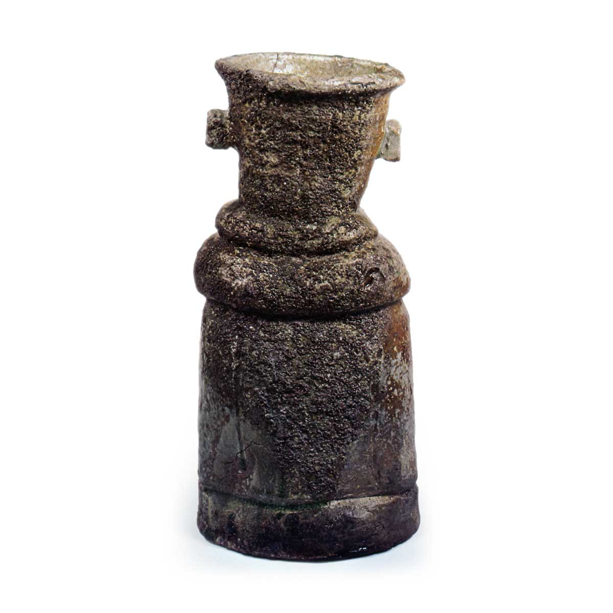 伊贺耳付花器 伊贺伊贺耳付花器 2025.09.11 伊贺耳付花器 高29.4厘米 口径11.0~11.5厘米 胴径14.4厘米 底径13.4~14.0厘米造型与前图基本相同,但颈部略向右倾斜,肩部呈圆弧状阶梯状,胴体饰有六道细长的纵向刨痕。粗粝的灰釉均匀覆盖形成灰色釉面肌理,背面则呈现红色烧结效果。器底边缘局部残留玻璃粉。