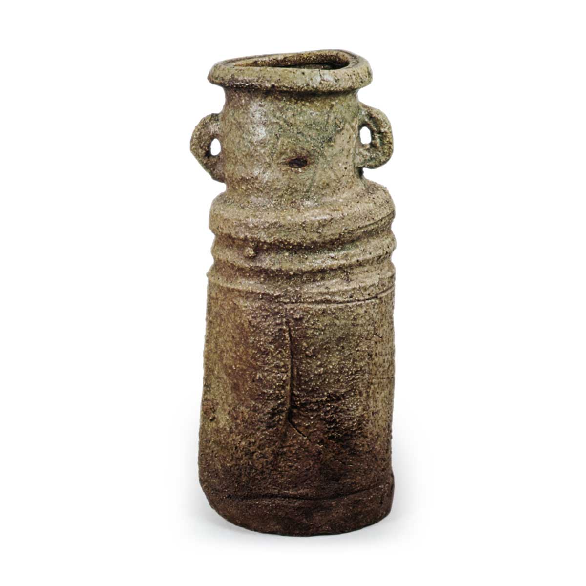伊贺耳付花器 伊贺伊贺耳付花器 2025.09.11 伊贺耳付花器 高27.5厘米 口径9.2~10.0厘米 底径12.3厘米肩部环绕两道深雕纹,颈部饰桧垣纹线雕,两侧配圆耳,器身纵向笤篱纹以面切风格处理。正面因灰烬剧烈附着形成玻璃釉,背面则呈现赤色烧结质地,局部可见玻璃釉流淌痕迹及两道铁锈流痕。此器物由京都矢仓家传承,据传曾为京都乐家第十一代庆入所藏。