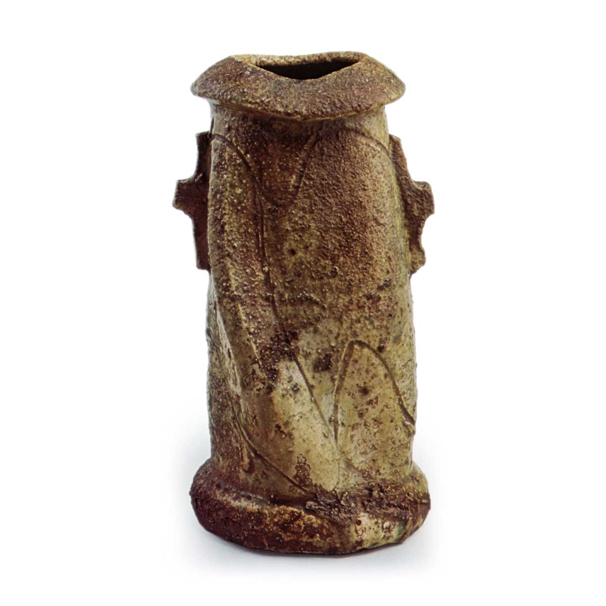 伊贺耳花瓶 伊贺伊贺耳花瓶 2025.09.11 伊贺耳花瓶 高25.4厘米 口径7.0厘米 宽15.2厘米 底径13.5厘米口部斜切为平坦的镇状,器身背面刻棱呈三角形,正面左侧弓形扭转,底部呈圆座状。从正面至背面以奔放的刮痕技法刻出山路状纹路,背面亦刻有两道纵向刮痕。正面薄施灰釉形成焦皮效果,背面则呈现淡红色烧结质地。