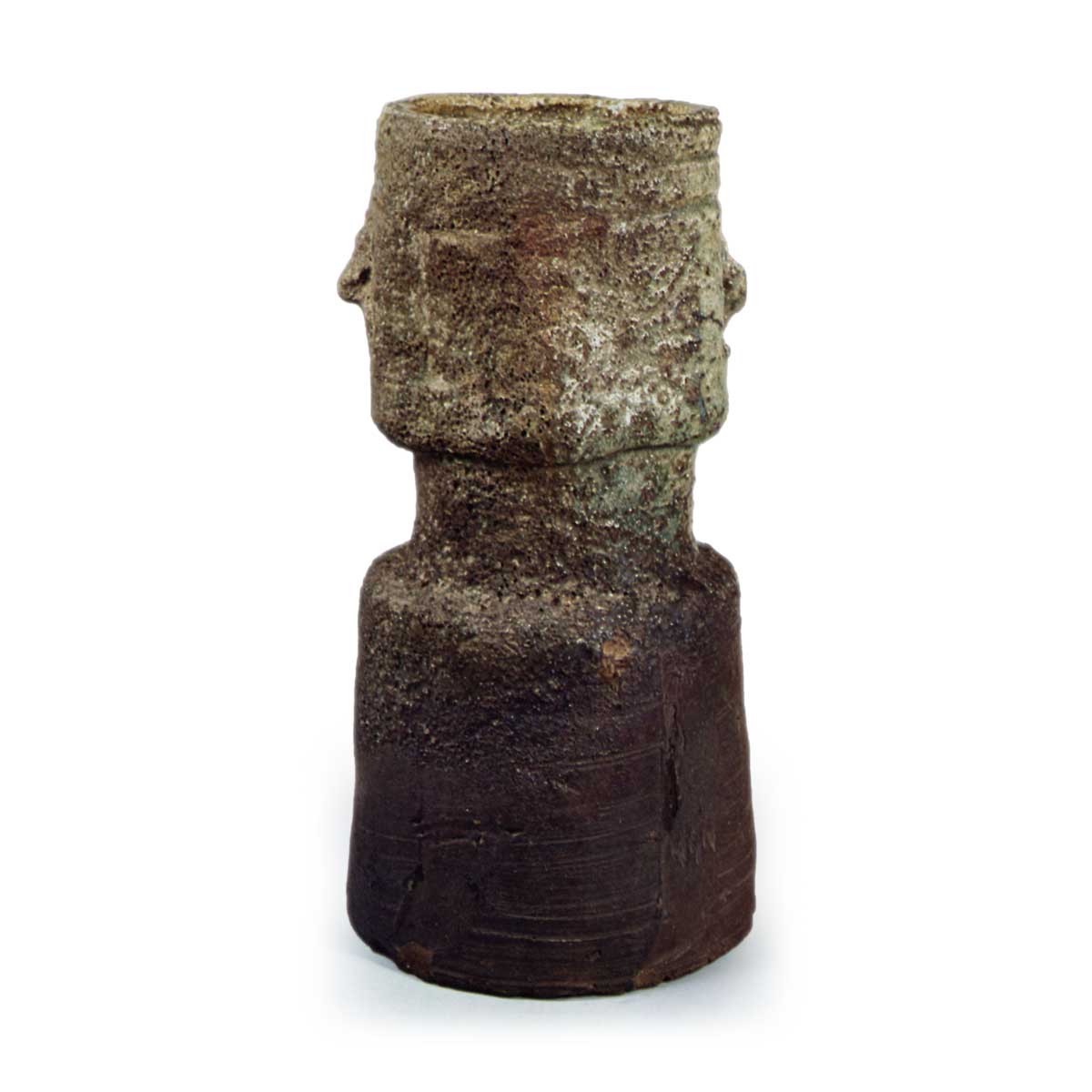 伊贺杵形花瓶 伊贺伊贺杵形花瓶 2025.09.11 伊贺杵形花瓶 高26.7厘米 口径9.9×10.7厘米 底径13.0×13.2厘米此为瓶身中部收窄的杵形花瓶。瓶口处设有小耳。瓶身背面饰有线刻桧垣纹,底部刻有八道粗秃笋纹。正面因灰烬剧烈覆盖形成深暗焦痕,裙边可见黑色焦土肌理。背面经高温烧结呈赤色,流淌着两道玻璃釉痕。底足两侧按惯例开有钦付孔(一侧两处,另一侧一处),现均已填塞。