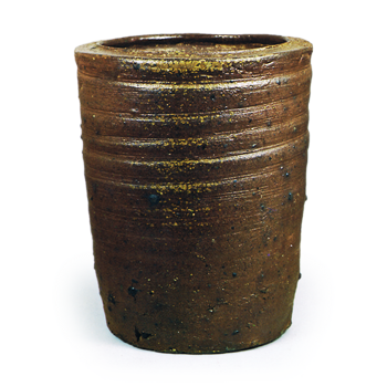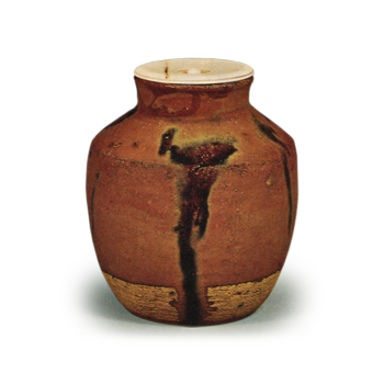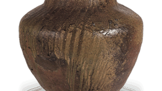 伊贺耳形水指 伊贺伊贺耳形水指 X Facebook Hatena Bookmark LINE Pinterest 复制 2025.09.112025.11.14 伊贺耳形水指 高20.3厘米 口径13.7~14.3厘米 左右21.2厘米 底径18.5~19.5厘米此为口部两侧附圆耳、胴部强力收束的阔口袋形水指。胴体虽呈不规则四方形,但存在一条显著的窑裂纹。器身饰有五道纵向纹理,正面因灰釉附着形成焦皮玻璃釉效果,背面则呈现赤色烧结质地,局部残留薄层灰釉。此水指散发着深邃的寂寥韵味。