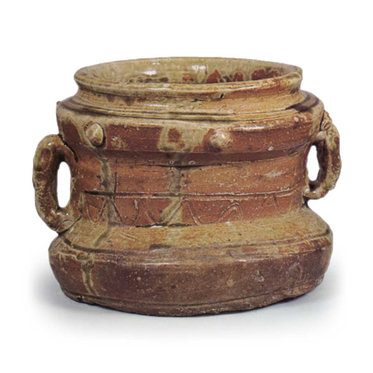 器身分段处理,两侧配以宽大耳耳,肩部环绕六枚箍座,器身饰以横向纹理与波状纹样。背面厚施灰釉形成玻璃釉,正面则呈现鲜红的烧结效果,局部薄施玻璃釉。