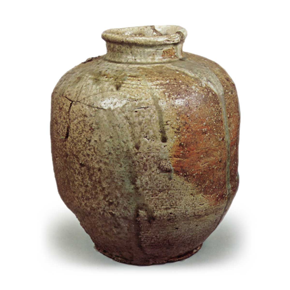伊贺壶 伊贺伊贺壶 2025.09.12 伊贺壶 高30.2厘米 口径10.7厘米 胴径25.0厘米 底径15.1厘米此乃桃山时期伊贺烧壶中最为杰出的作品之一。口部饰玉缘,肩部外展,壶身下端略收束,造型质朴而力道十足,底座低矮呈圆座状。自口沿至壶身下缘,单侧薄施草绿色玻璃釉,另一侧则呈现赤褐色烧结焦痕,其间流淌一条玻璃釉痕。如此景色鲜明的壶器实属罕见。器身厚实,壶身局部出现两道窑裂纹,底面呈木屐底状。此壶在古董收藏家间享有盛名。
