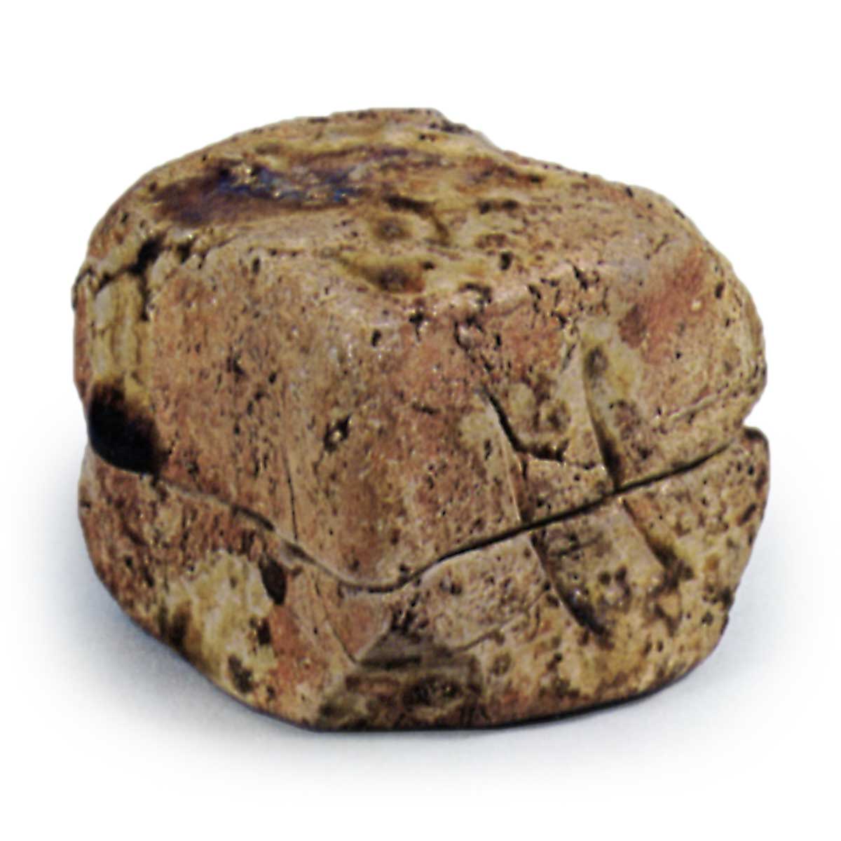 伊贺伽蓝石形香合 伊贺伊贺伽蓝石形香合 2025.09.12 伊贺伽蓝石形香合 高5.1厘米 口径2.8厘米 底径5.1厘米造型粗犷有趣。应是将方形土坯切开制成盖与主体。从盖至主体刻有纵向刨痕,盖面至侧面薄施黄褐色灰釉,土胎烧得通红坚实。
