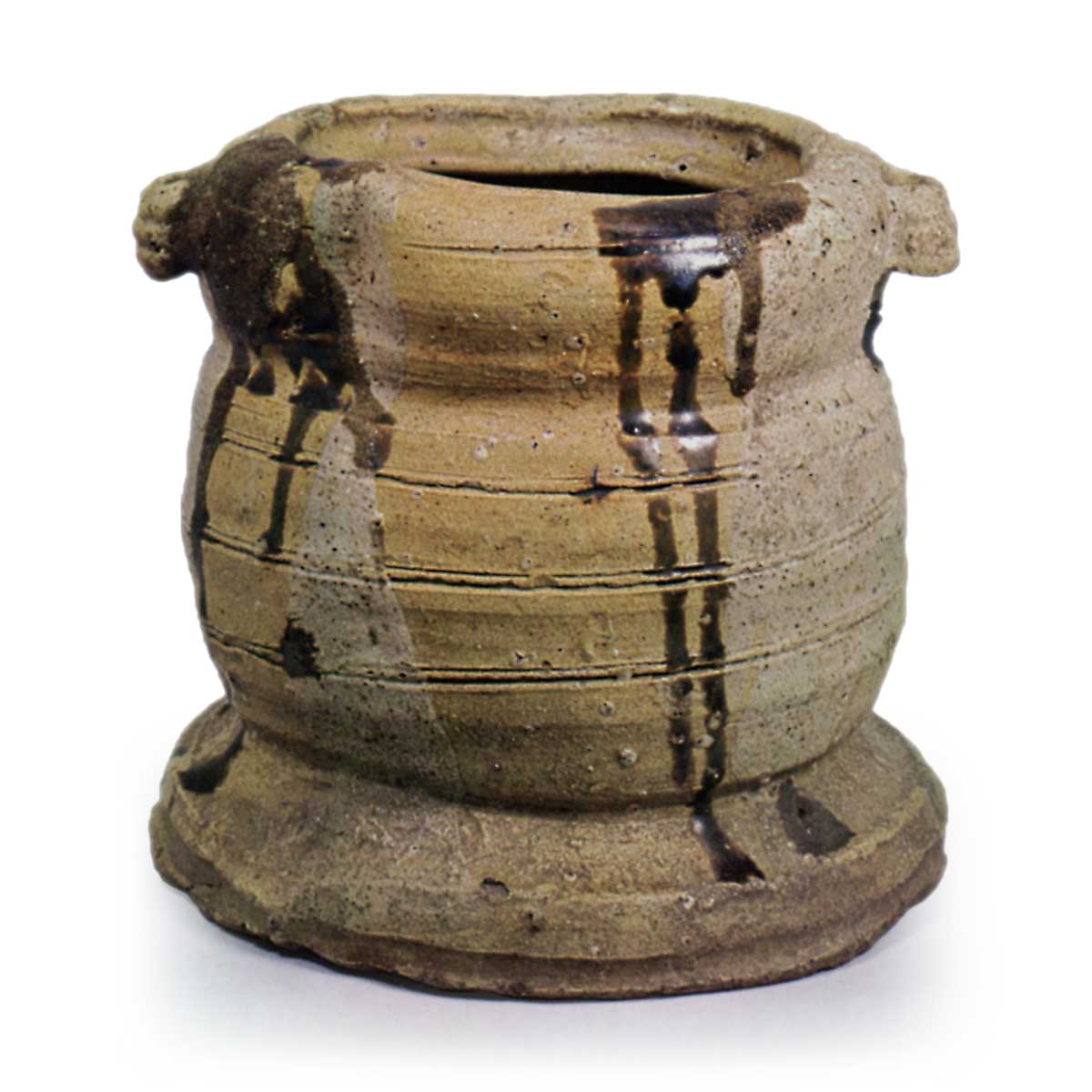 美浓伊贺耳付水指 伊贺美浓伊贺耳付水指 2025.09.122025.11.14 美浓伊贺耳付水指 高19.4厘米 口径12.1×12.9厘米 左右21.0厘米 底径21.2厘米作为美浓伊贺水指的代表作,其制作风格与伊贺水指几乎无异。但未施比德罗釉,而是于侧面等数处流淌长石釉,再从肩部至裙边随意泼洒铁釉,形成独特釉色景观。其浑厚稳重的形态在美浓伊贺作品中尤为出众。底足为线状底,窑印以笤帚痕刻制。